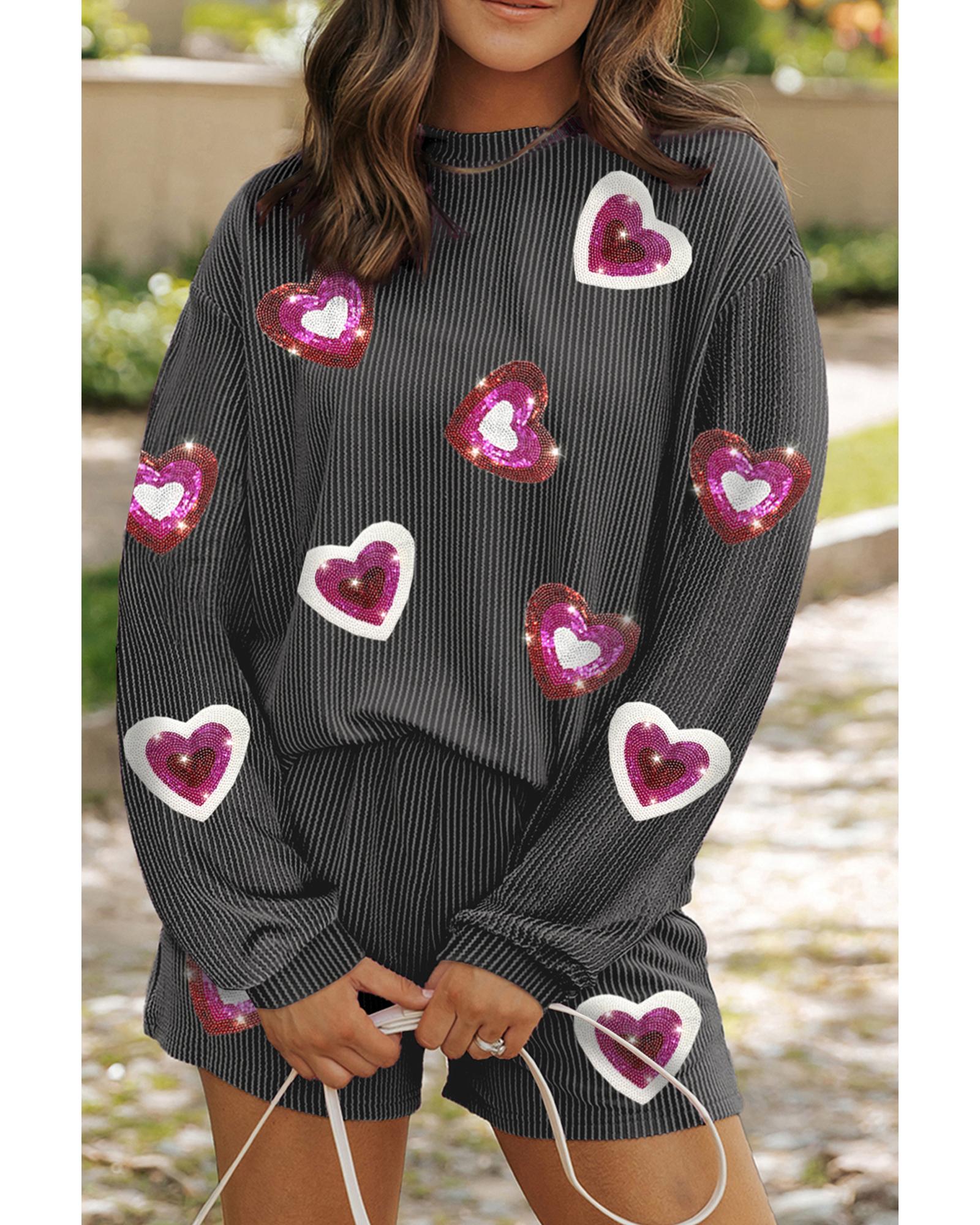 Carbon Grey Valentine Sequin Heart Corded Pullover and Shorts Set – L