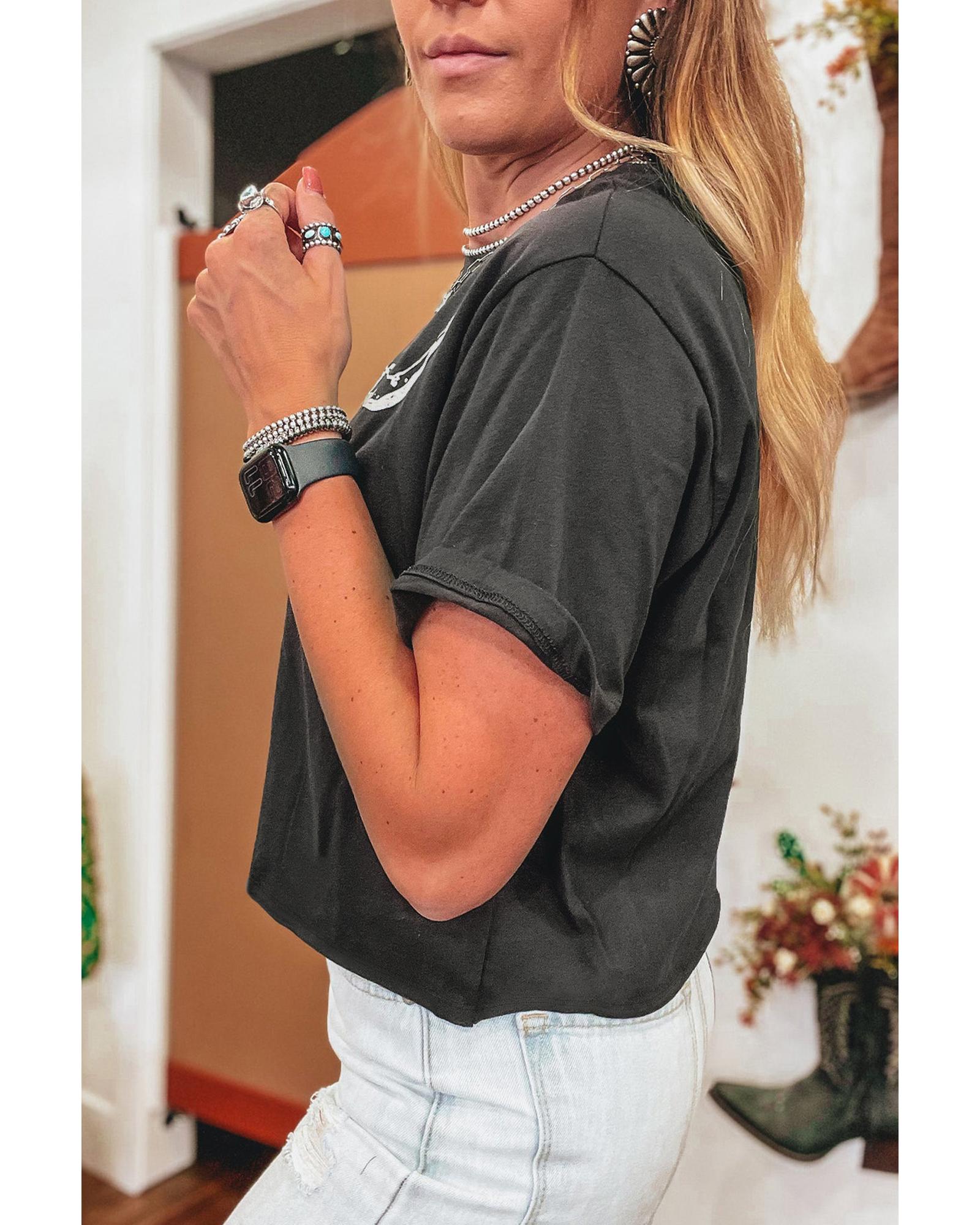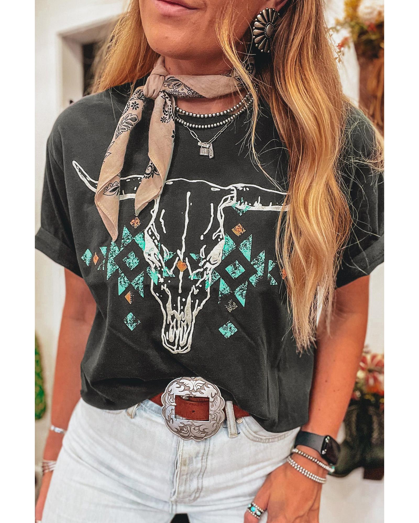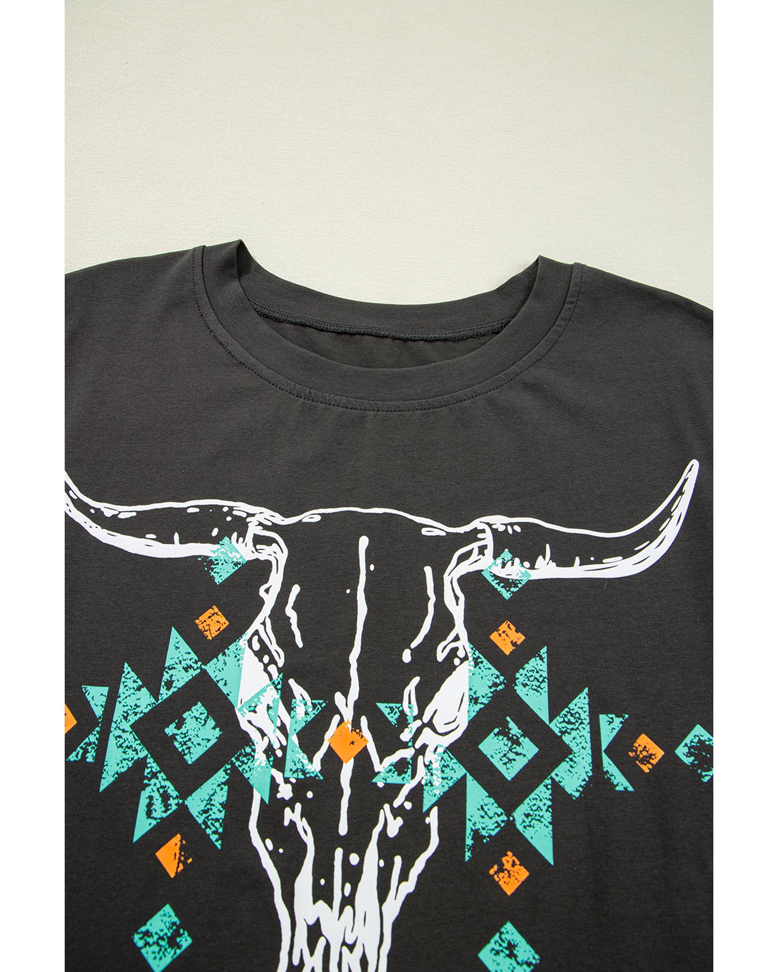 - Carbon Grey Vintage Western Bull Head Skull Turquoise Aztec Graphic T Shirt