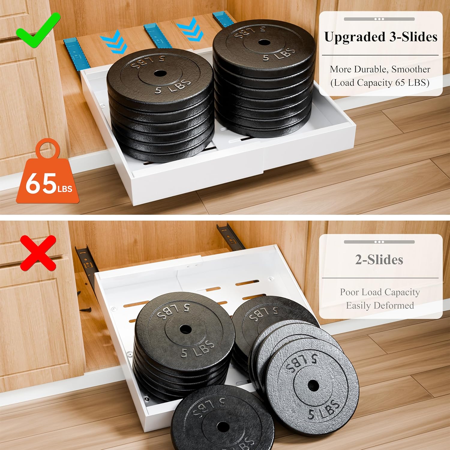 • HEAVY-DUTY BUILD & SMOOTH GLIDE: Crafted from premium carbon steel with a 3-rail damping slide system, these organizers handle up to 65 lbs per shelf. The drawers glide smoothly and quietly even under heavy pots, appliances, or pantry essentials.