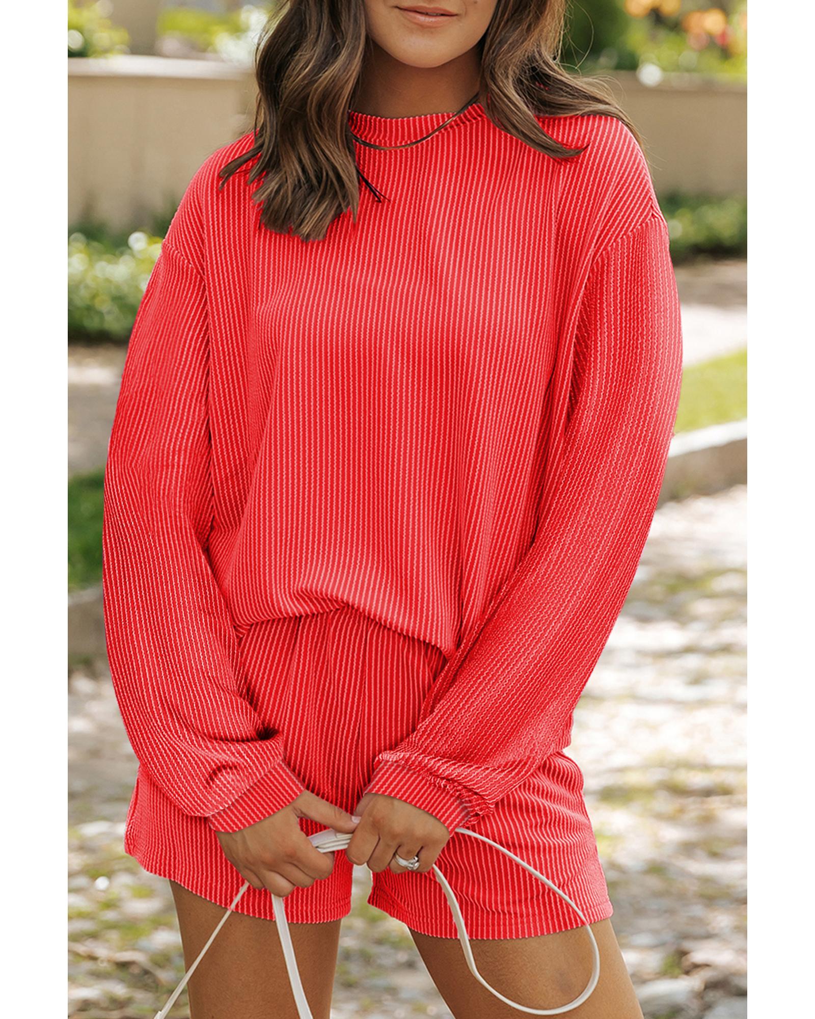 - Casual Corded Knit Long Sleeve Top and High Waist Shorts Set
