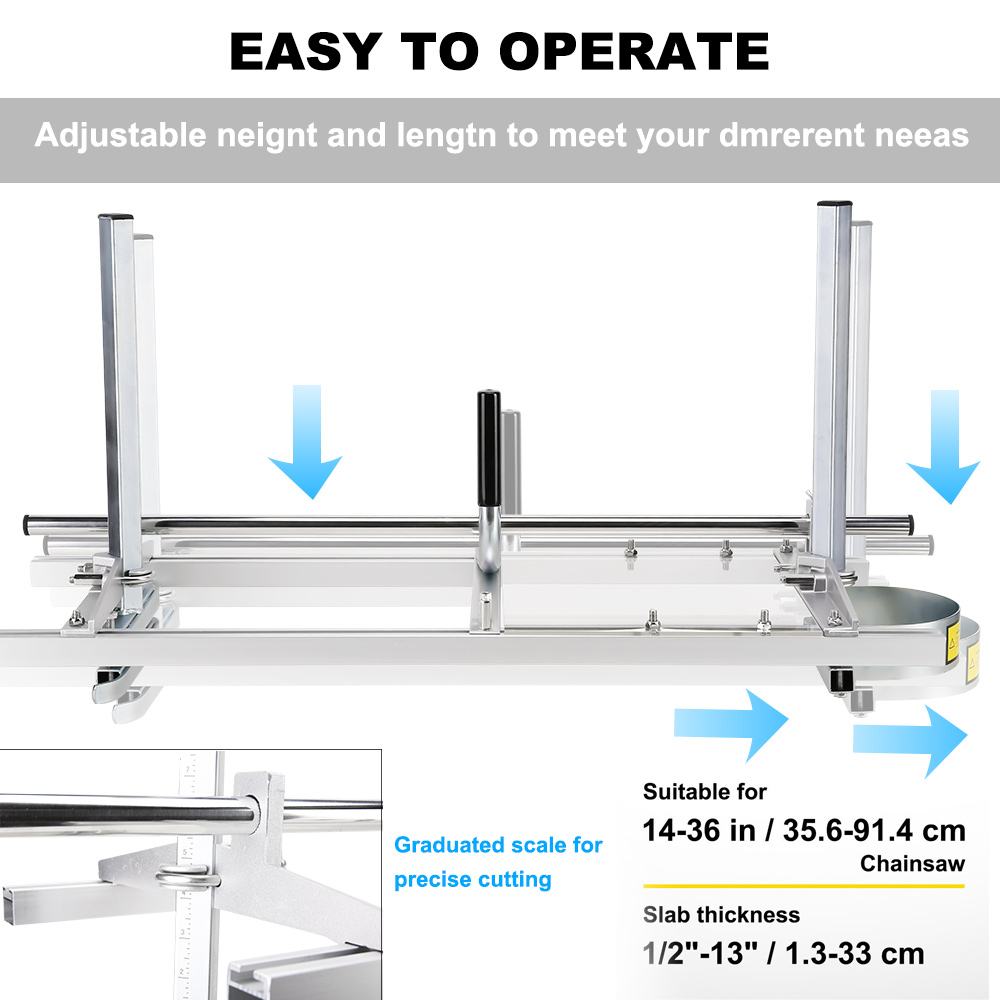 The height and length of our saw mill are both adjustable to meet your different needs. It is compatible with a 14″ -36″ chainsaw(not included).