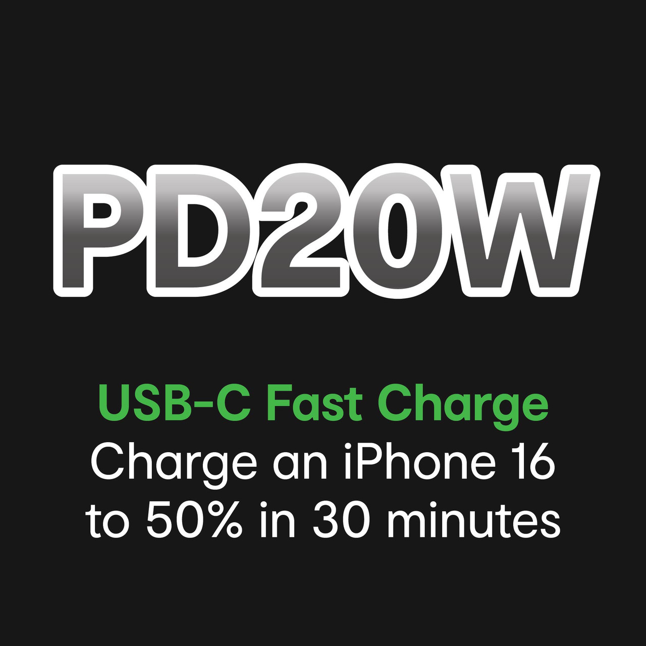 Get 50% charge in 30 minutes*. This 20W USB-C fast charger powers your iPhone 16 or Galaxy device up to 4 faster than standard USB.