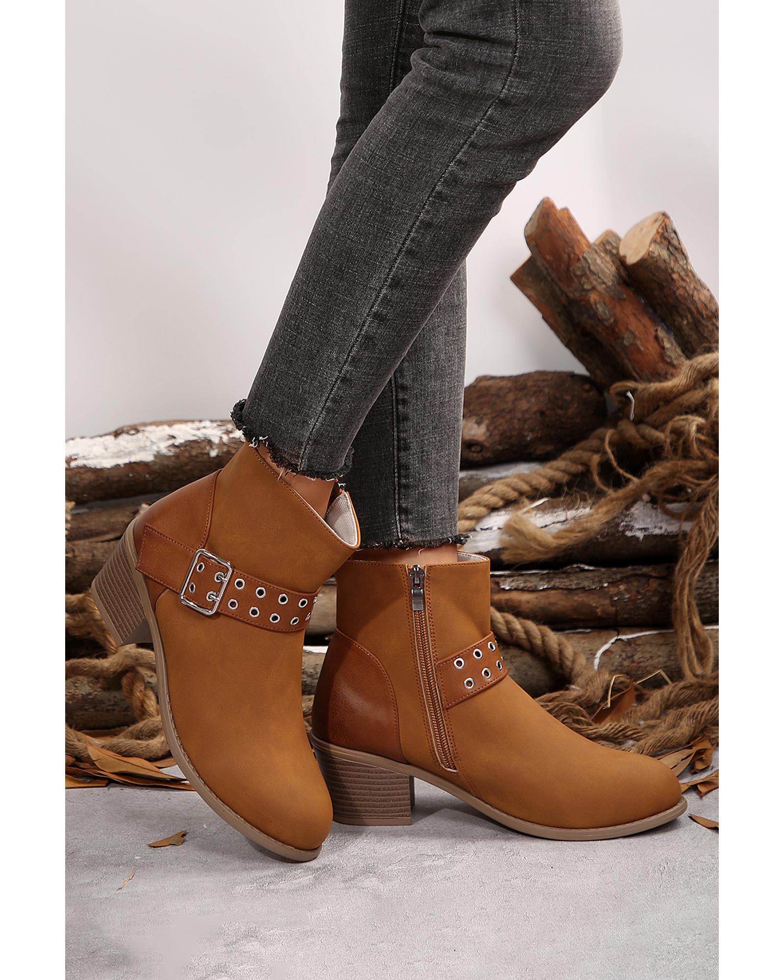 Chestnut Eyelet Buckled Chunky Heel Faux Leather Ankle Boots – 41 EU