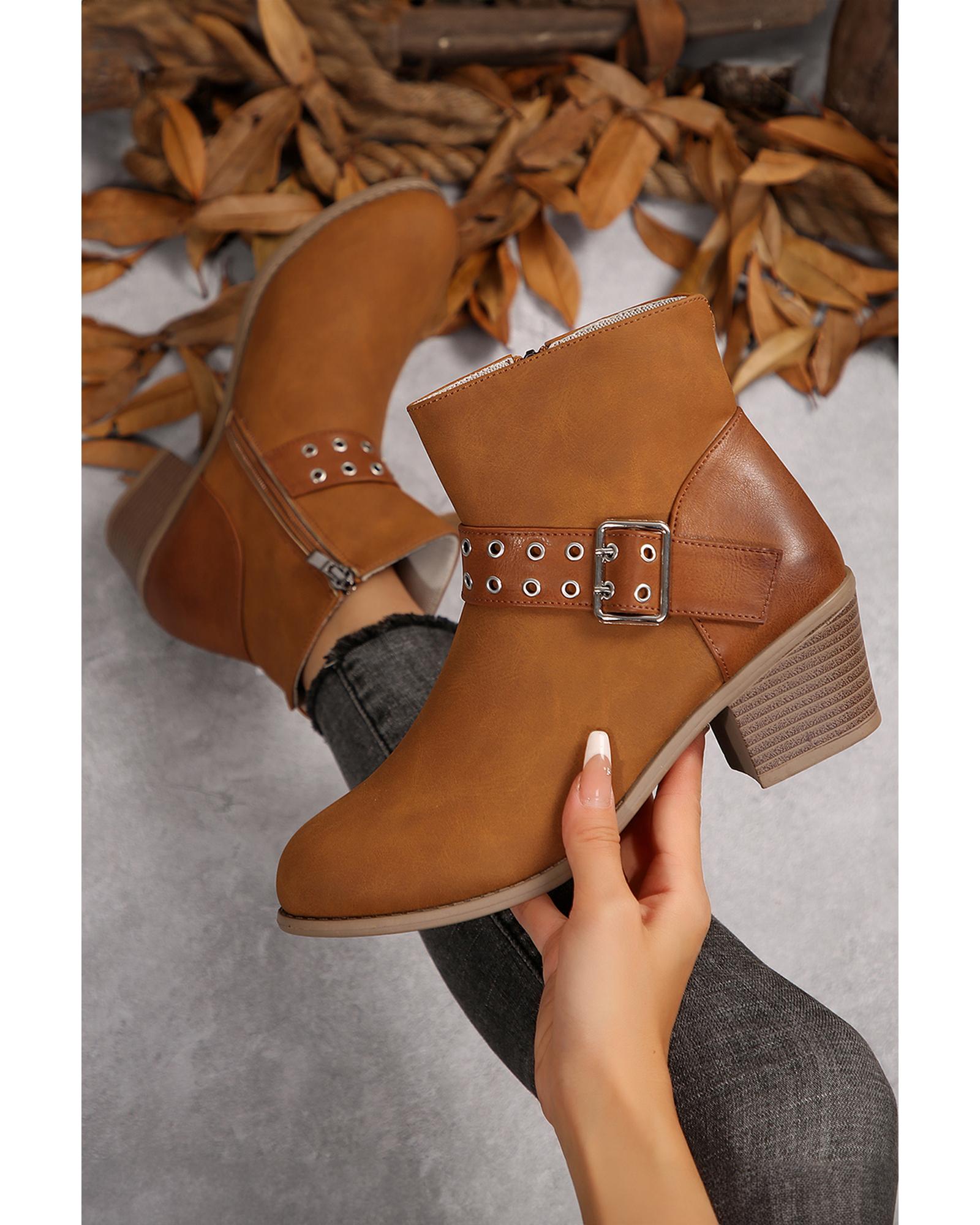Chestnut Eyelet Buckled Chunky Heel Faux Leather Ankle Boots – 42 EU