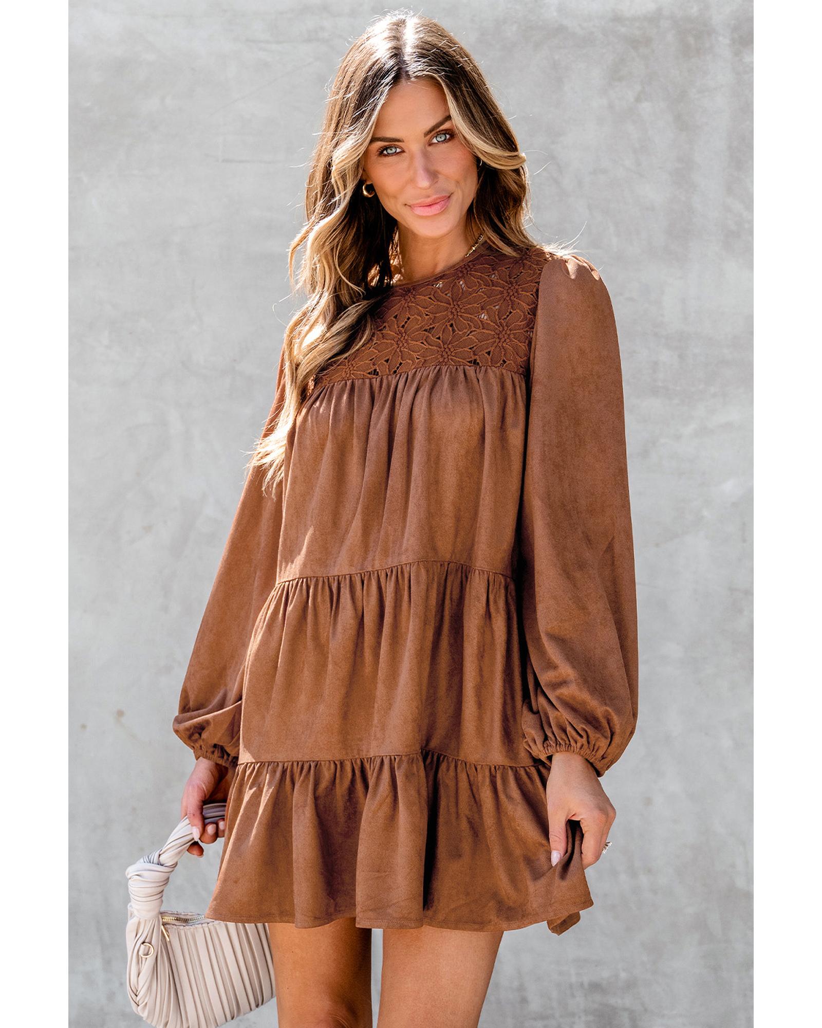 Chestnut Floral Lace Crochet Tiered Ruffled Mini Dress - XL