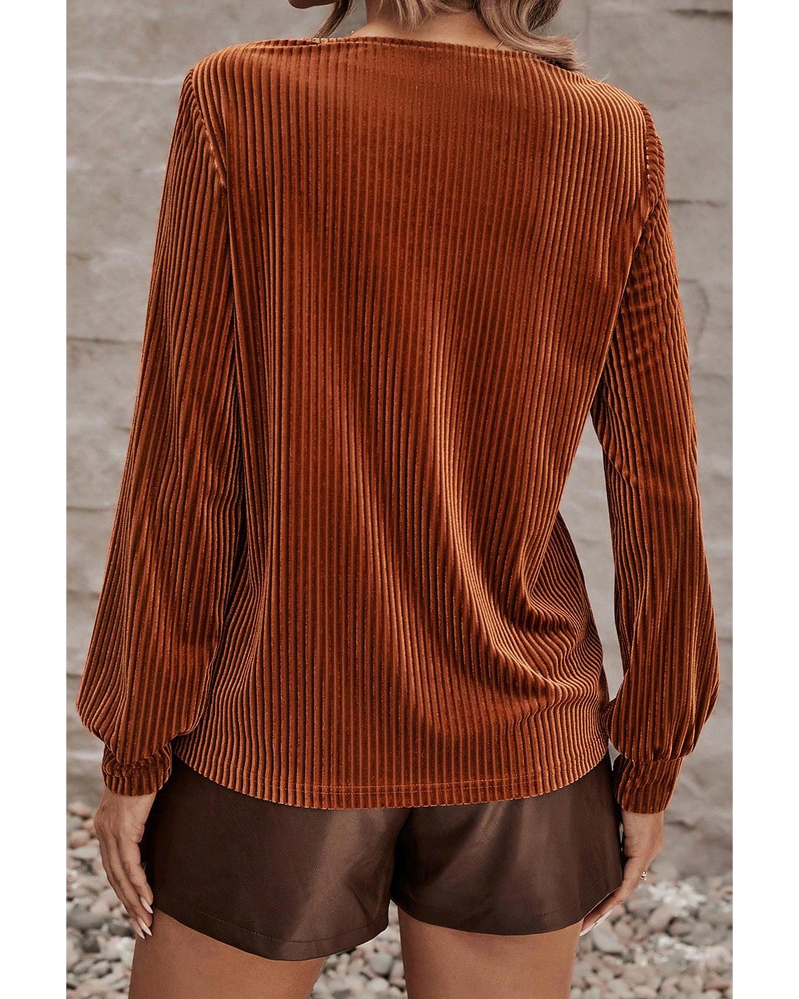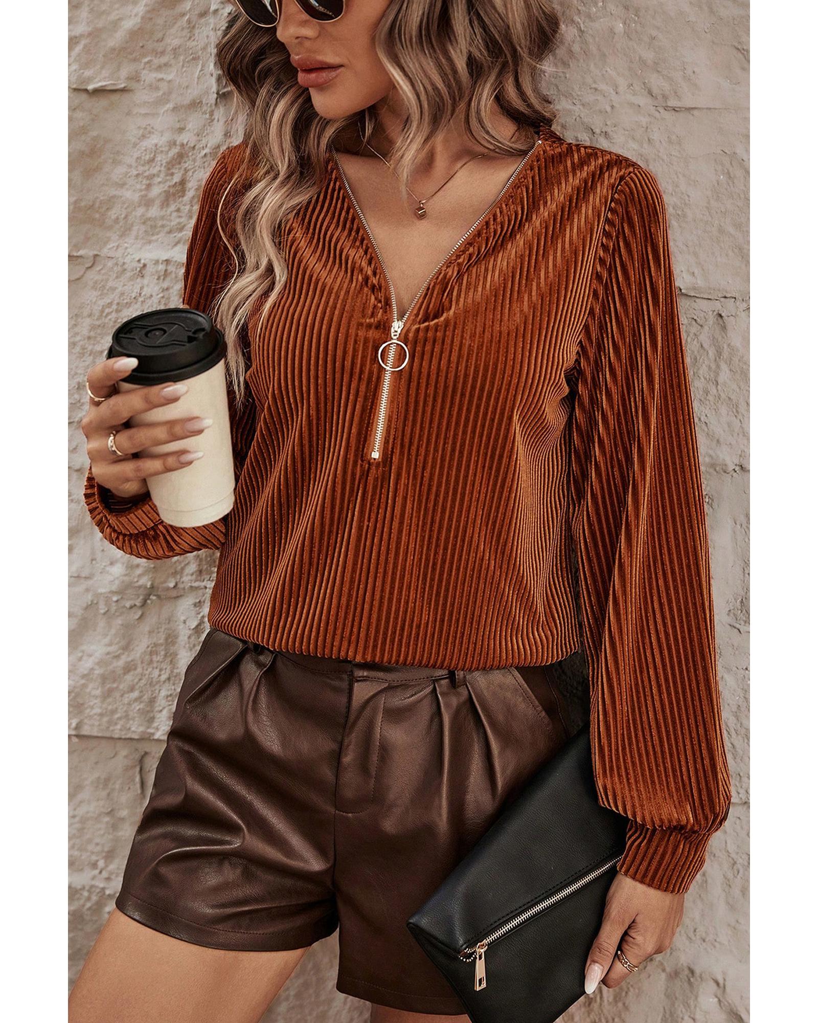 Chestnut Half Zip V Neck Ribbed Velvet Top – S