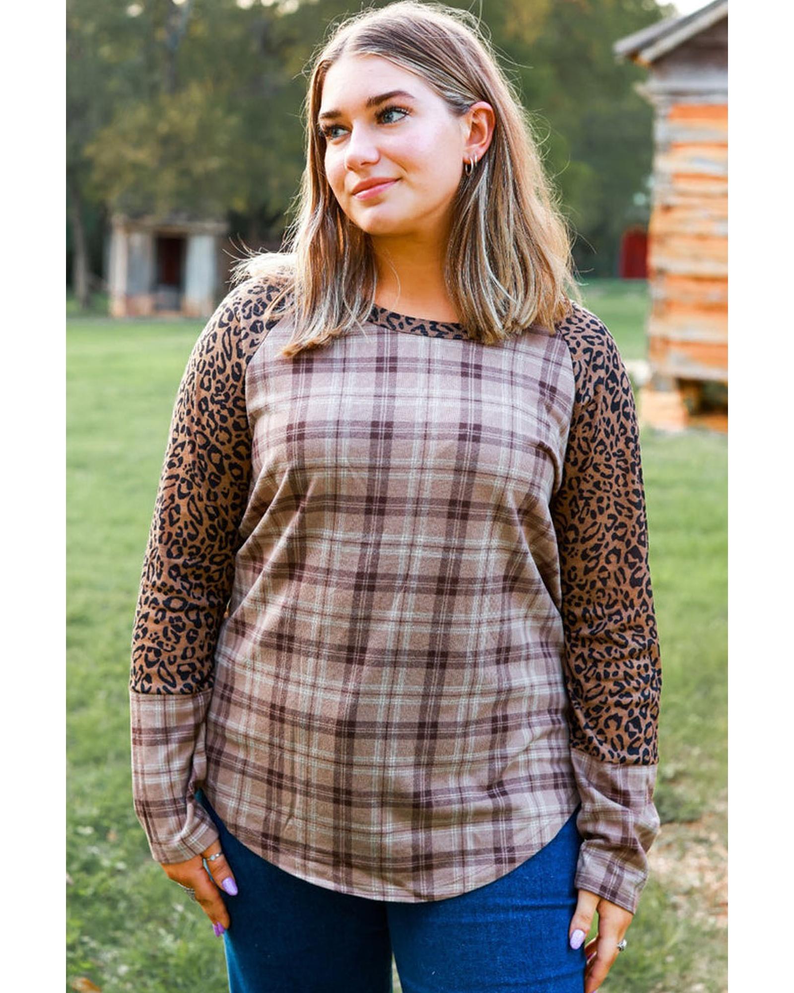 - Stay ahead of the fashion game with our Chestnut Plus Size Leopard Raglan Sleeve Plaid Topn