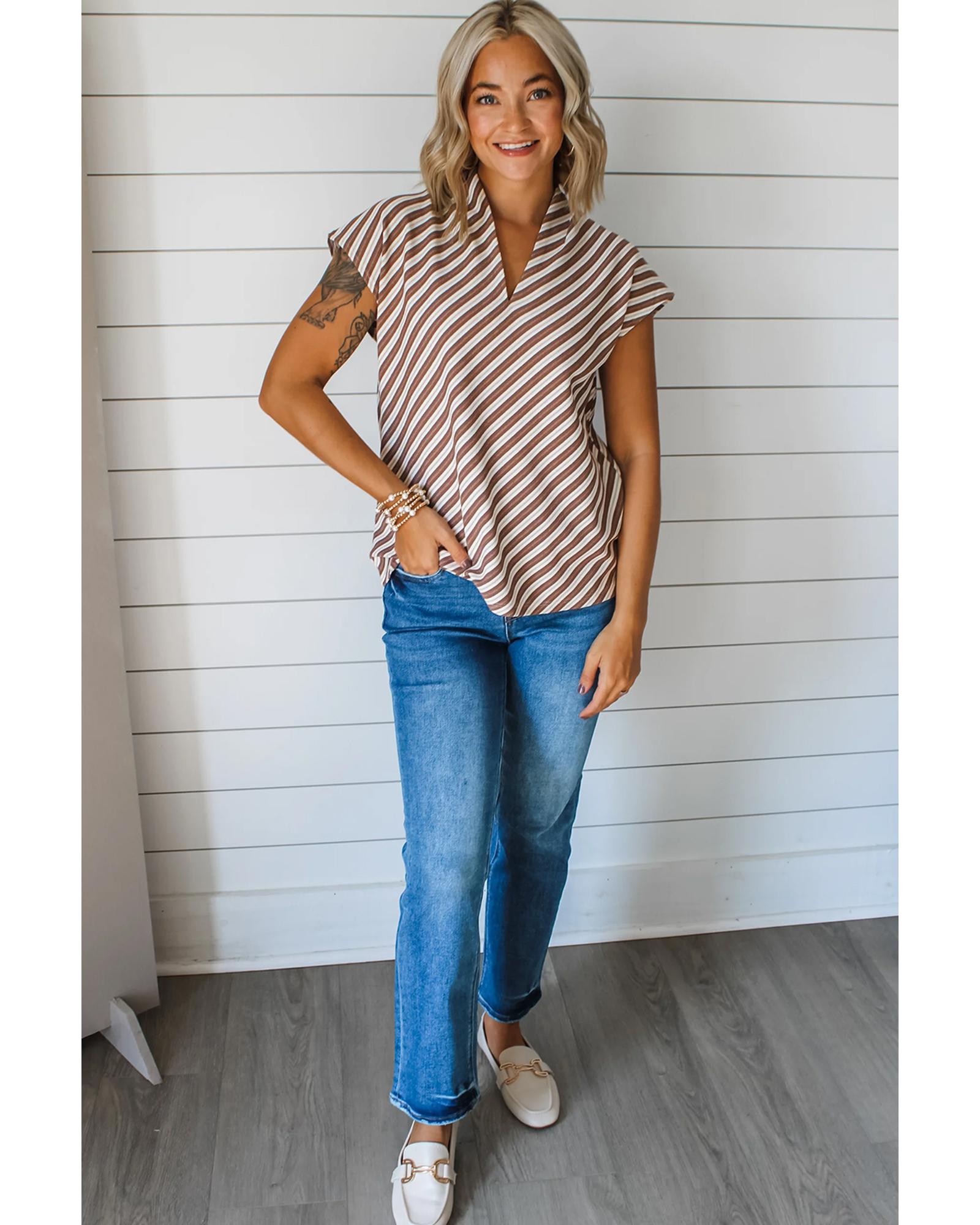 Chestnut Striped Stand V Neck Short Sleeve Blouse – S