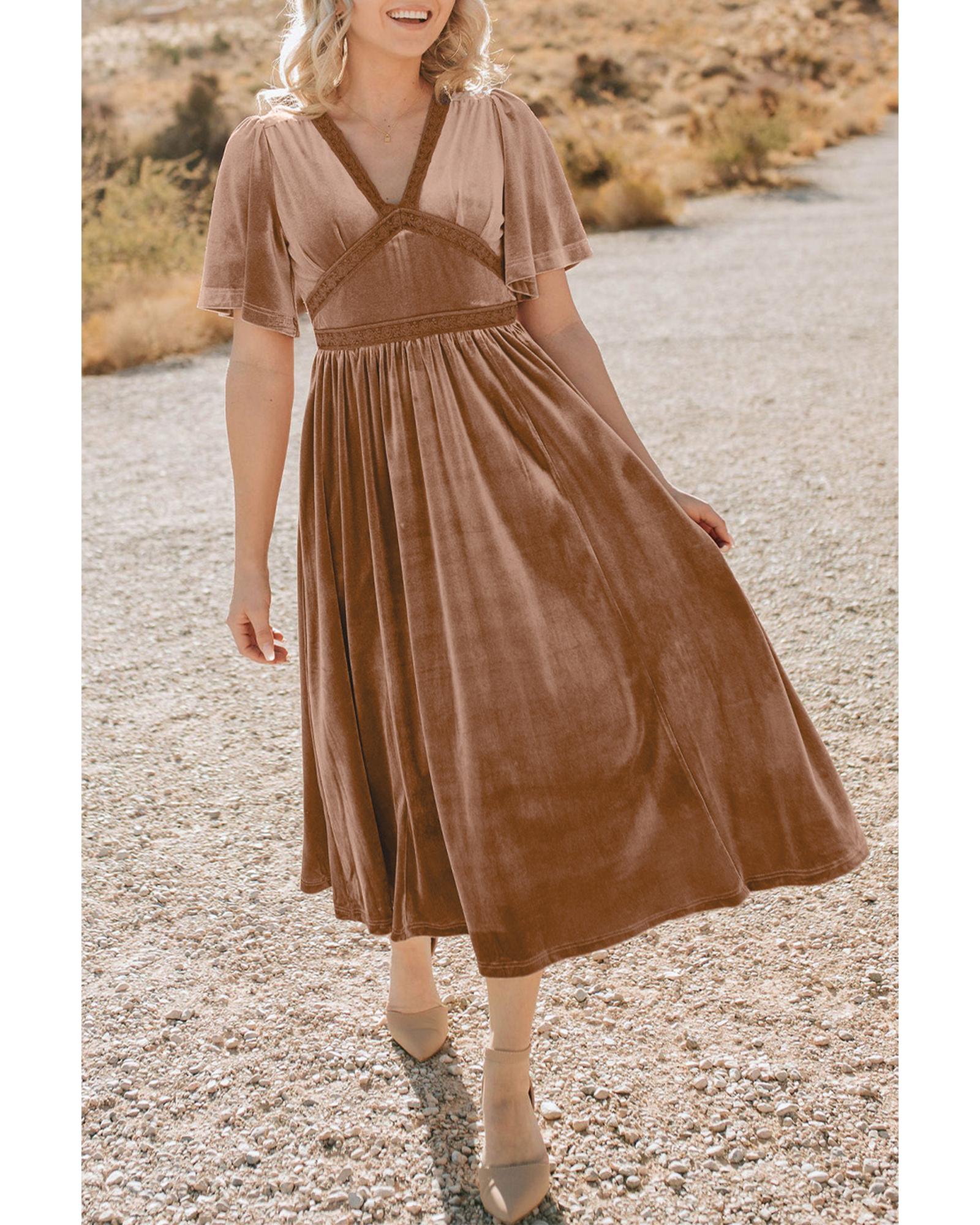 Chestnut Velvet Lacy V Neckline Short Sleeve Empire Waist Flowy Maxi Dress - S