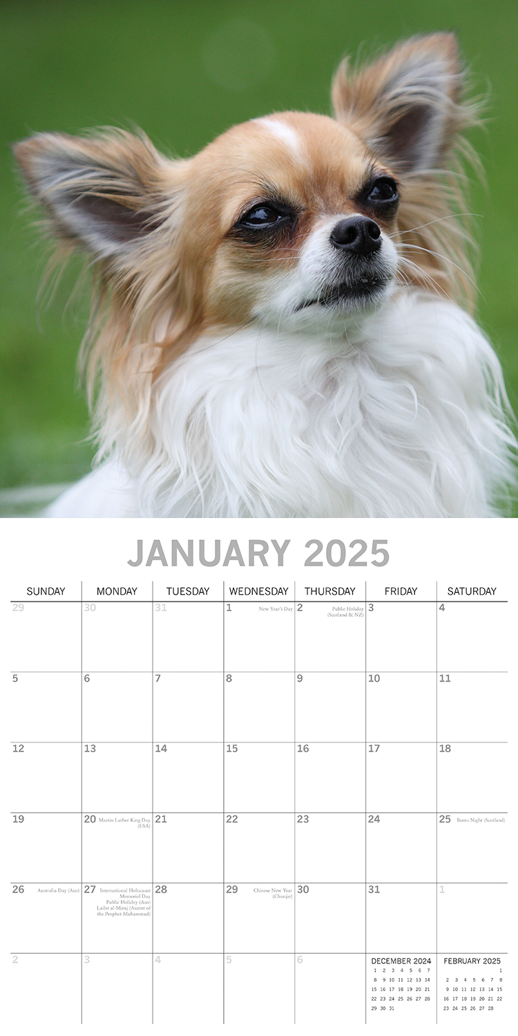 Chihuahuas are small, sprightly, loyal, and lively. They get their name from the desert state of northern Mexico. Legend says that they were sacred to the pre-Columbian people. Considering they average under five pounds, it is no wonder that they have a special attachment to the warm sun of Mexico. Chihuahuas are most comfortable in their owners’ arms, but they look rather cheerful alone and amongst themselves in this square wall calendar.This beautifully designed, brand-new calendar is both 100% plastic-free and fully recyclable. It comes shrink-wrapped in its original packaging and features: