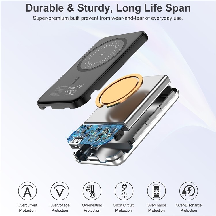 MagSafe magnetic wireless charger and Power bank in one, 5000mAh capacity, with USB Type-C and USB Type-A connections. Supports fast and wireless charging 10W.