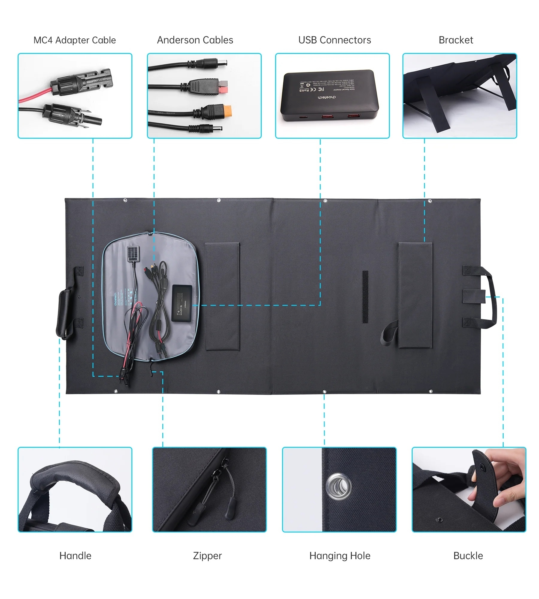 For a portable panel ideal for camping, van life and recharging RV batteries, the Choetech foldable 160-watt panel is built to withstand the elements, It’s versatile, durable, waterproof and extremely efficient – you can power up your devices on-the-go even in low-light areas and cloudy days. The panel includes a built-in kickstand for a 45 degree angle optimal sun exposure and comes with a bag which makes the panel easily portable. Choetech’s 160W panel can be combined with a power station for the full off-grid experience.