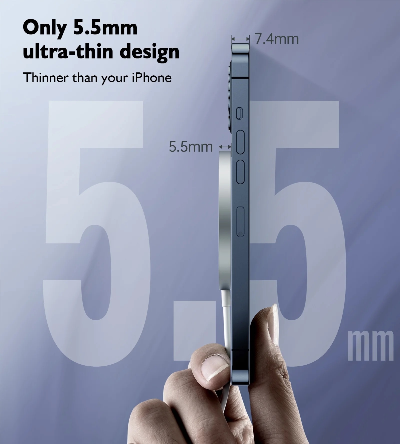 The circle design keeps your device neatly in place while it powers up, the MagSafe Wireless Charger magnetically attaches to your phone to ensure safe charging and no signal interference while you’re scrolling through your feed or gaming.