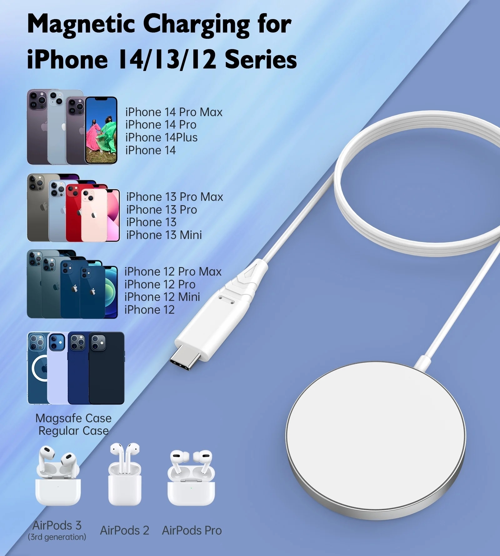 Compatible with iPhone Series 14 Pro Max/14 Pro/14 Plus/14, iPhone Series 13 Pro Max/13 Pro/13/13 Mini, iPhone Series 12 Pro Max/12 Pro/12 Mini/12, compatible with MagSafe and regular cases, Airpods 3/AirPods 2/ AirPods Pro.