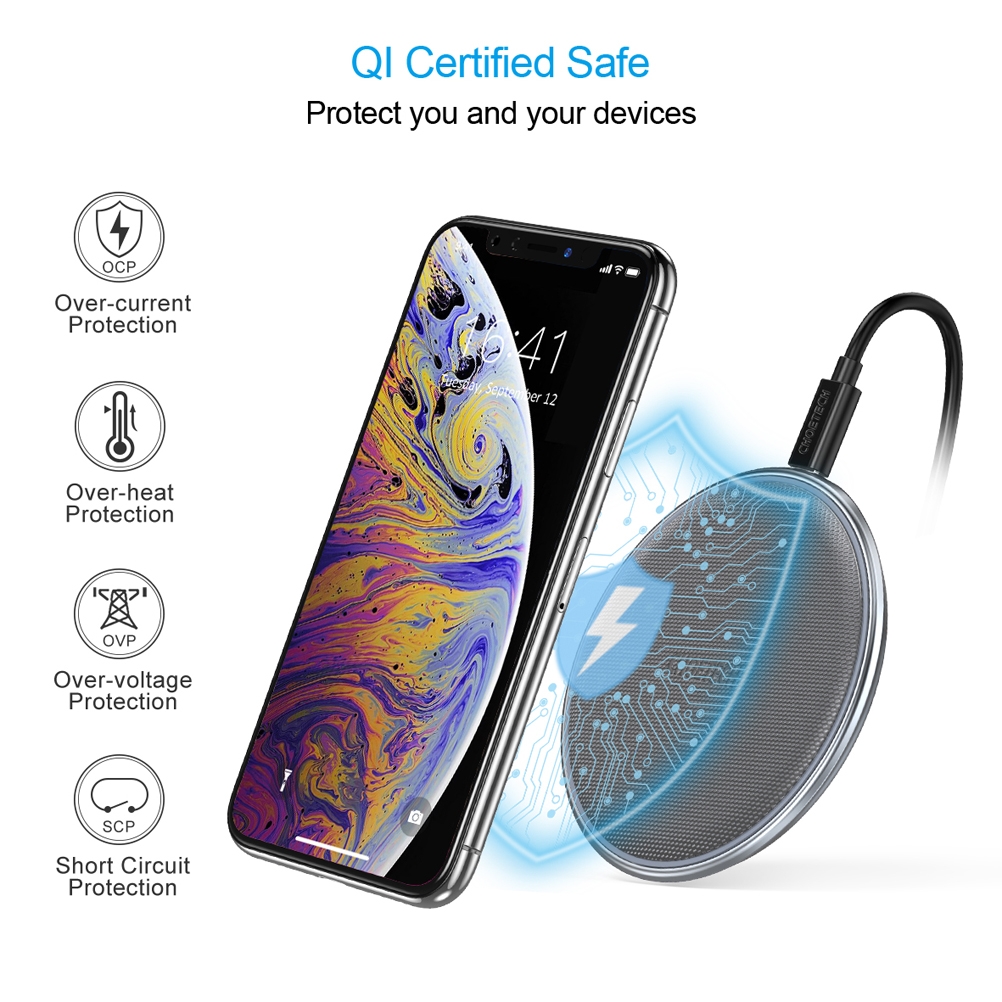 The wireless charger is CE, FCC, RoHS Certificed, Integrated smart chip inside provides temperature control, surge protection, short-circuit prevention, overheating, overvoltage prevention and more, never overcharges your battery or wastes energy.