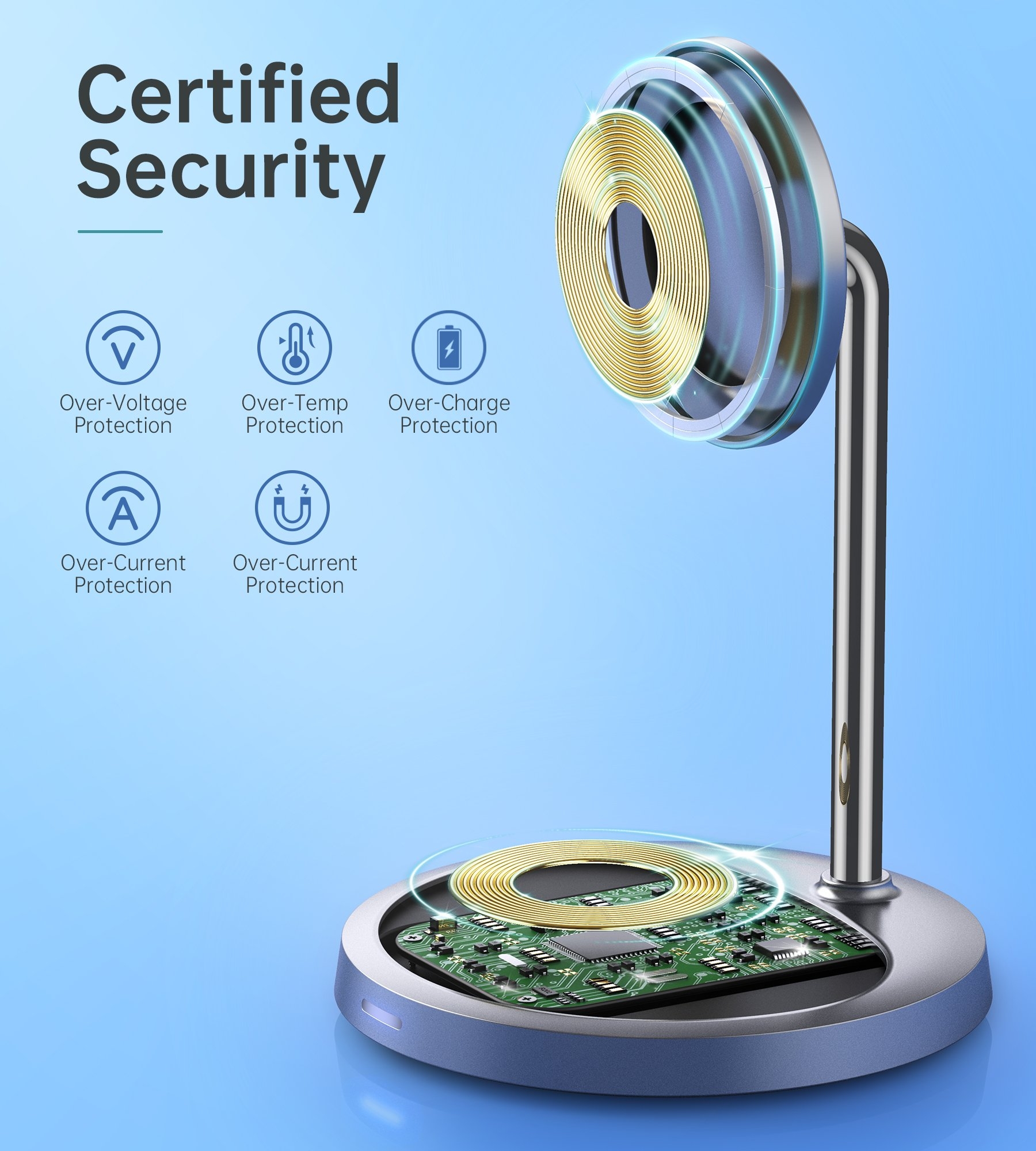Unique LED lights indicate the charging status of your smartphone and earbuds at the same time. Qi ETL Certified integrated smart chip keeps our wireless phone charger stand from over-charging, over-heating and short-circuit, providing a safe and secure charging environment.