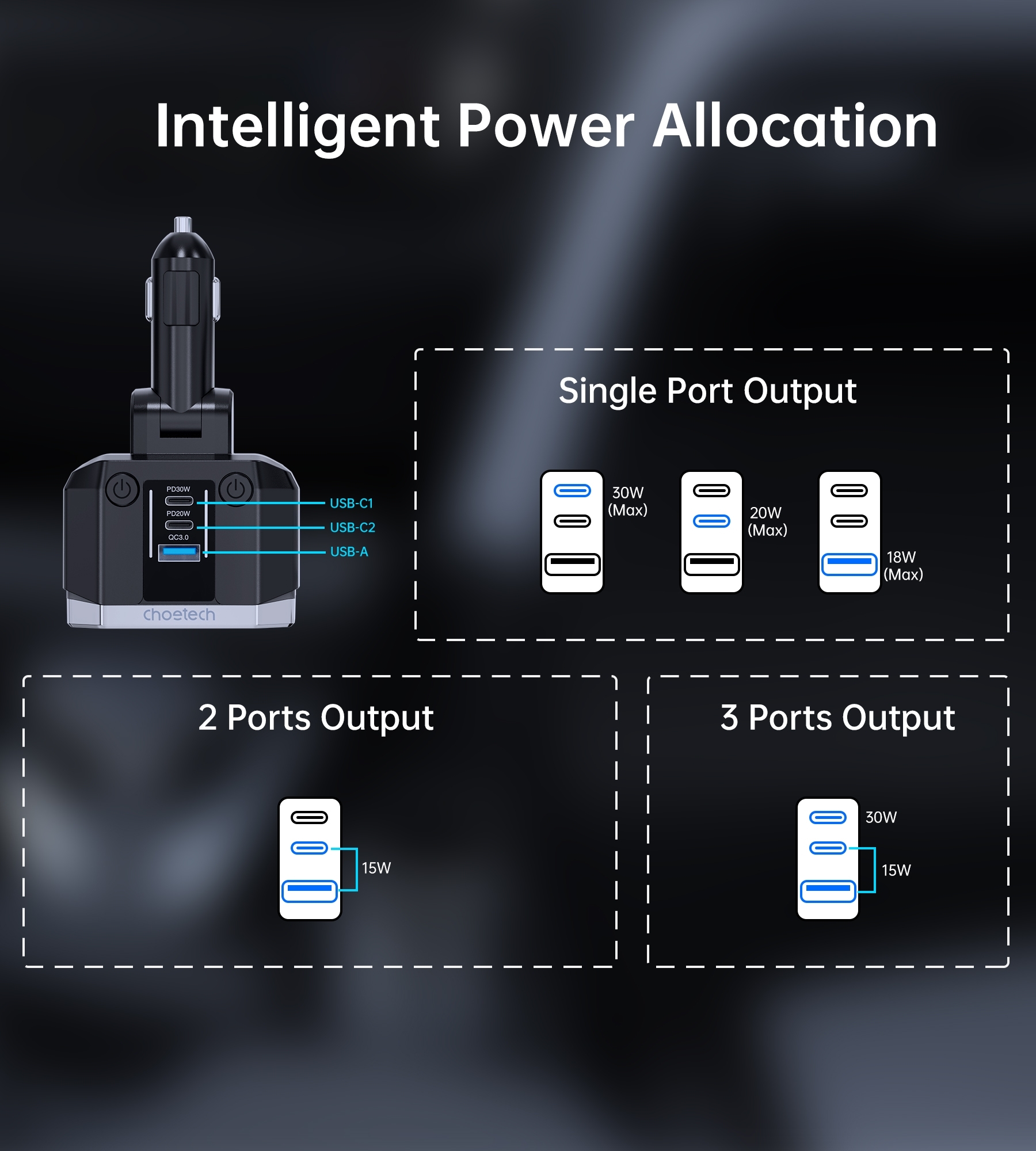 Adjusts power output for optimal charging speed, offering 30W to Type-C PD, 20W to the second Type-C, and 18W to Micro-USB A.