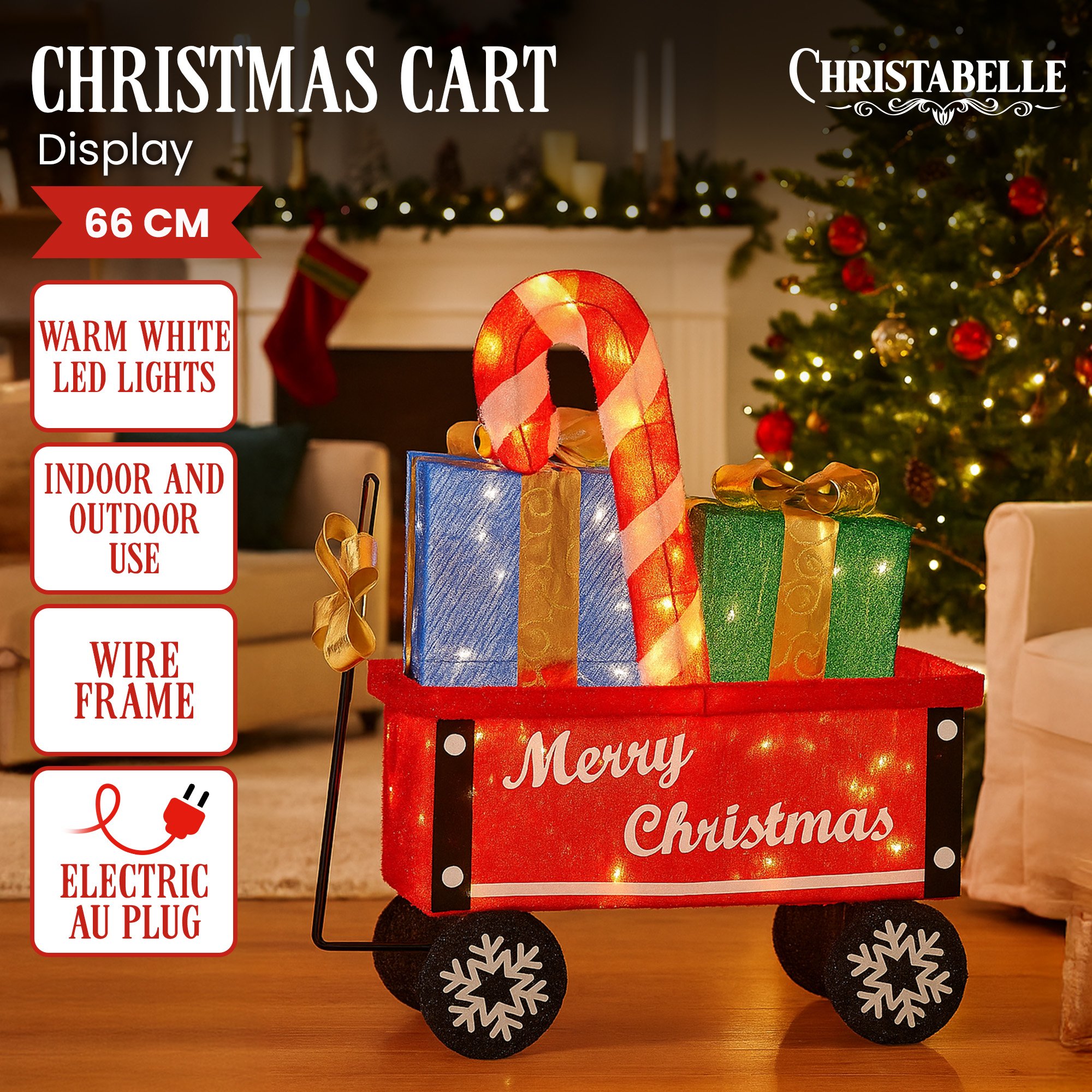 Christabelle Christmas Cart Display w/Candy Cane & Presents Warm White LED Lights Wire Frame Structure Indoor & Outdoor