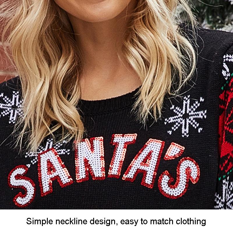 Christmas Women Pullover Sweater Santa Claus Embroidery Crew Neck Knit Sweater – Black – L