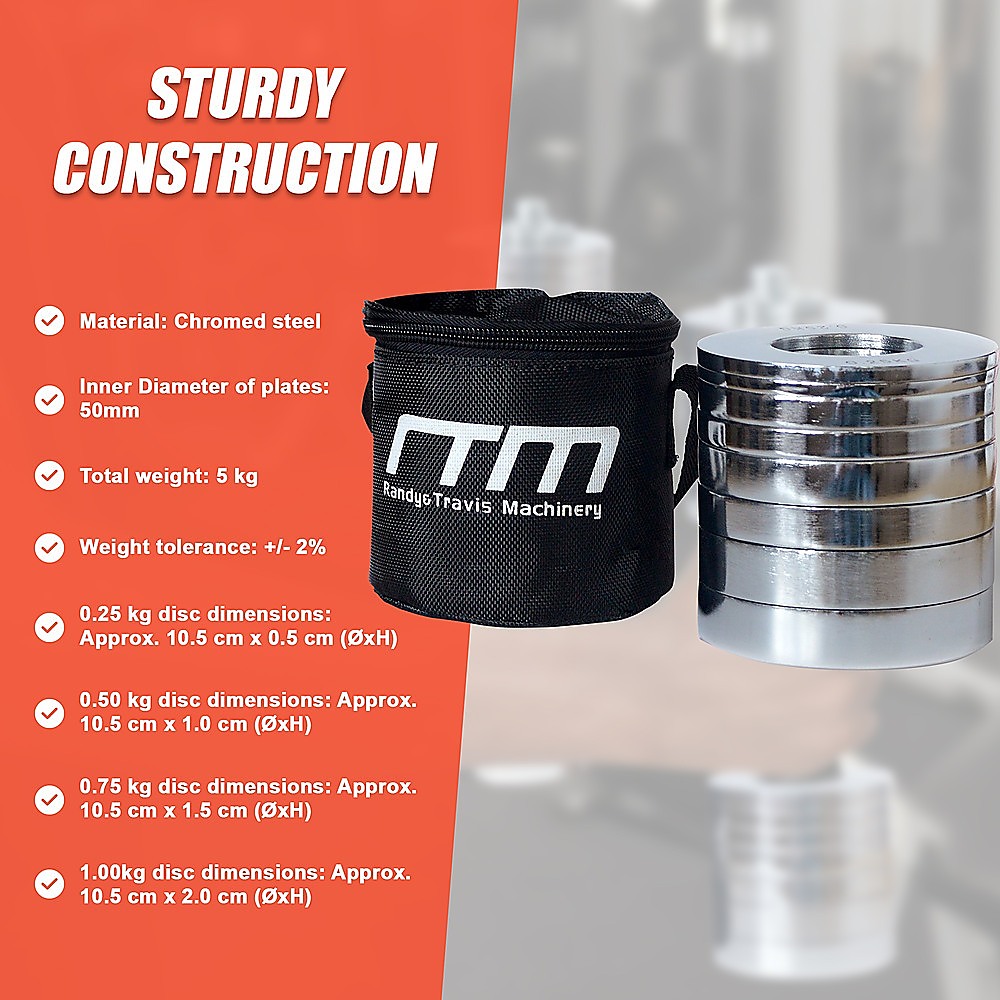 These metric fractional Olympic weight plates by Randy Travis Machinery range from 0.25 kg to 1.0 kg. Gradually build up your resistance, bit by bit, so you have less risk of sustaining an overuse injury from increasing the weight you lift by too large an increment. Whether you're a bodybuilder or just lift weights as part of a fitness or cross-training program for another sport, these fractional plates will serve you well with their fine-tuned sequence of training weights.