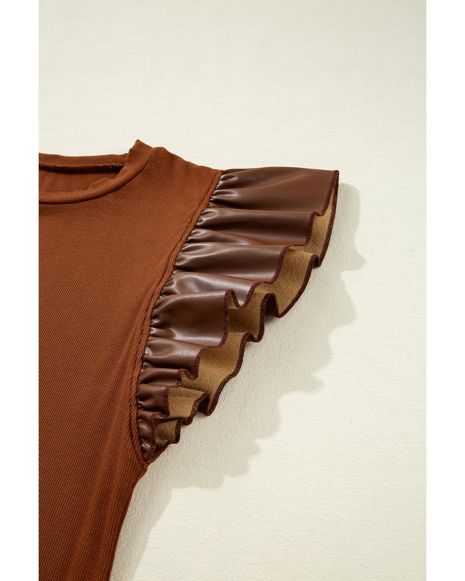 Cinnamon Leather Ruffle Sleeve Patchwork Round Neck Blouse – XL