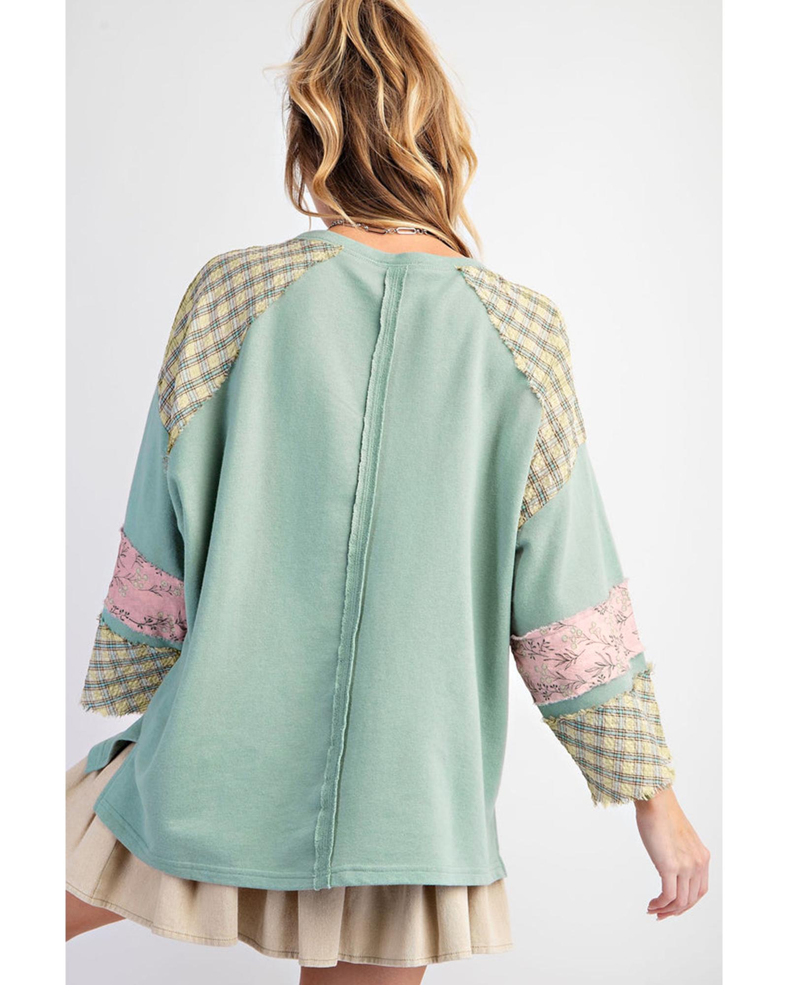 Clearly Aqua Plaid Floral Peace Heart Graphic Wide Long Sleeve Top – L