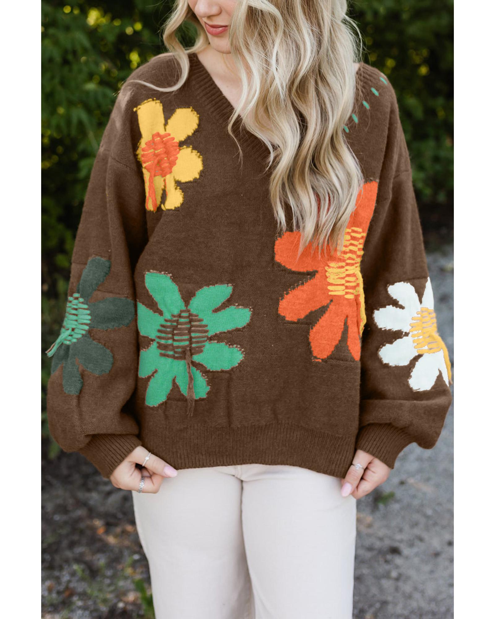 Coffee Big Flower Pattern V Neck Drop Shoulder Sweater – S
