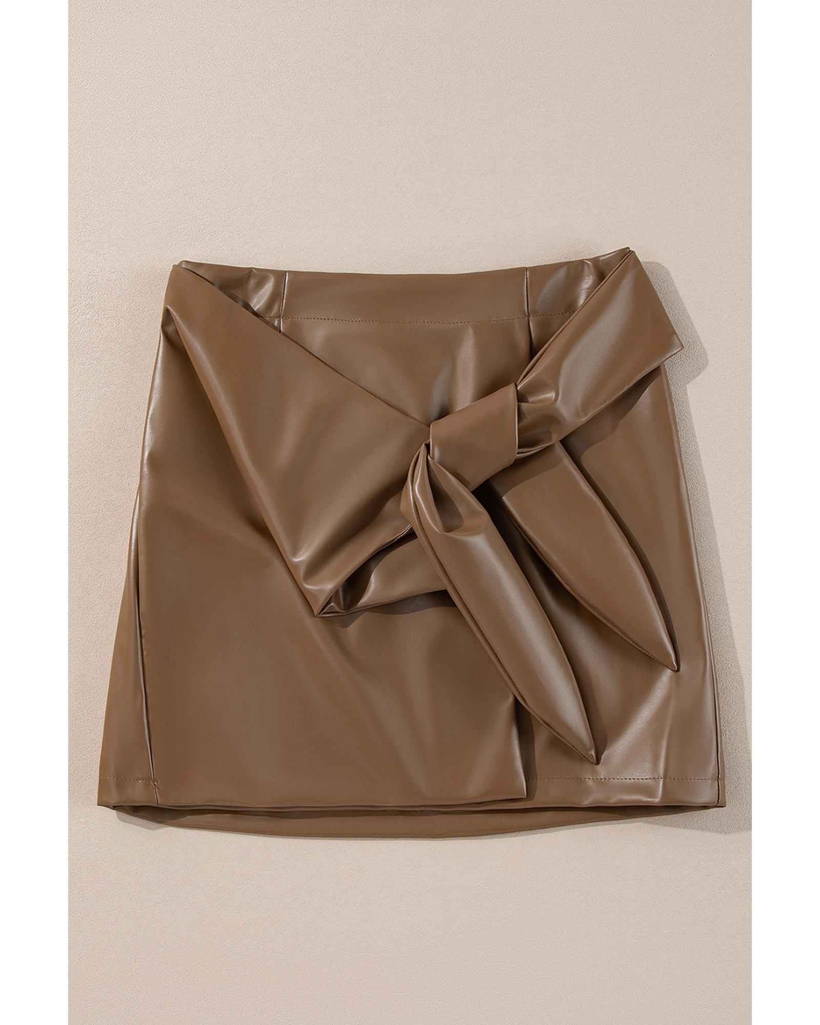 Coffee Bowknot Faux Leather Mini Skirt – S