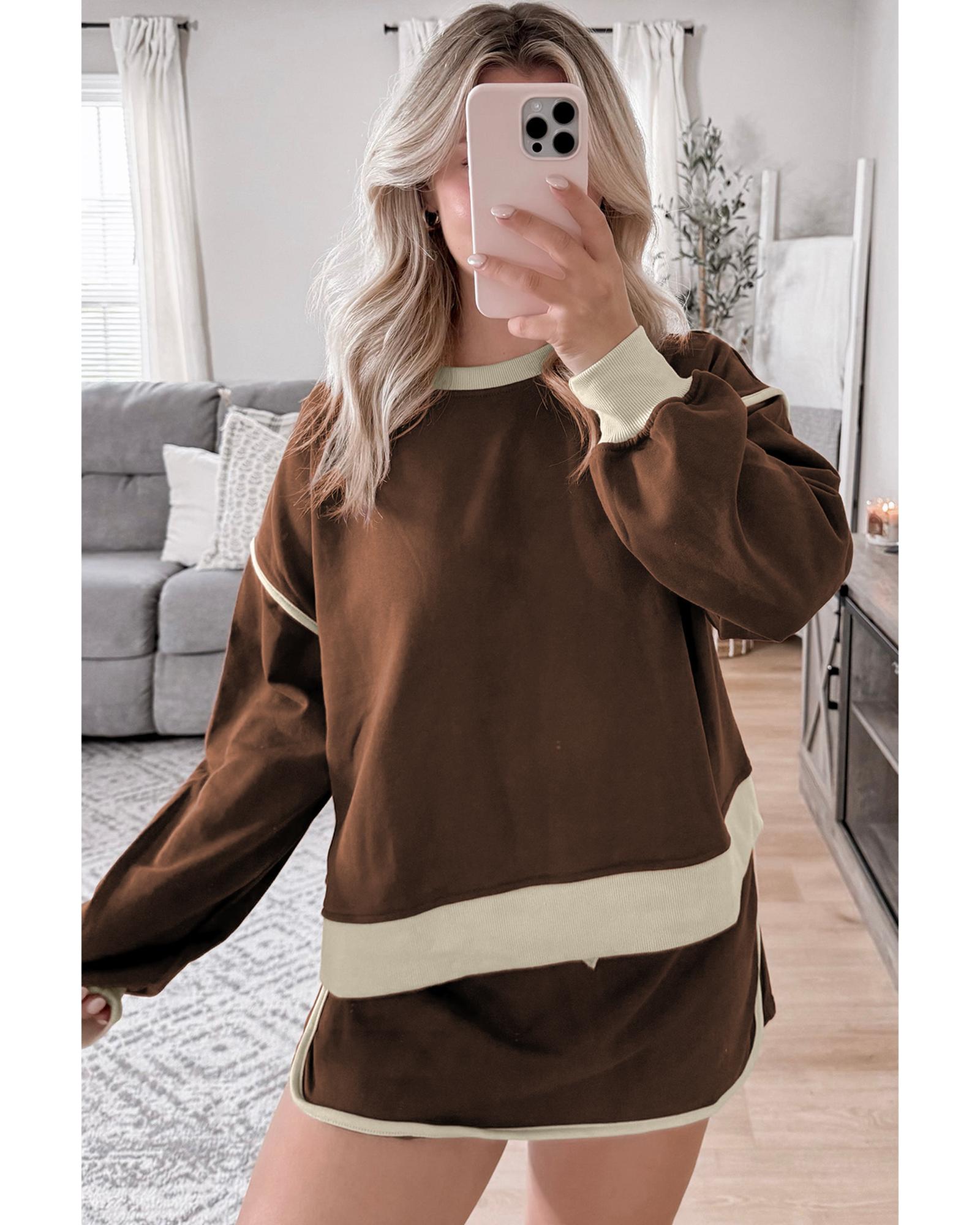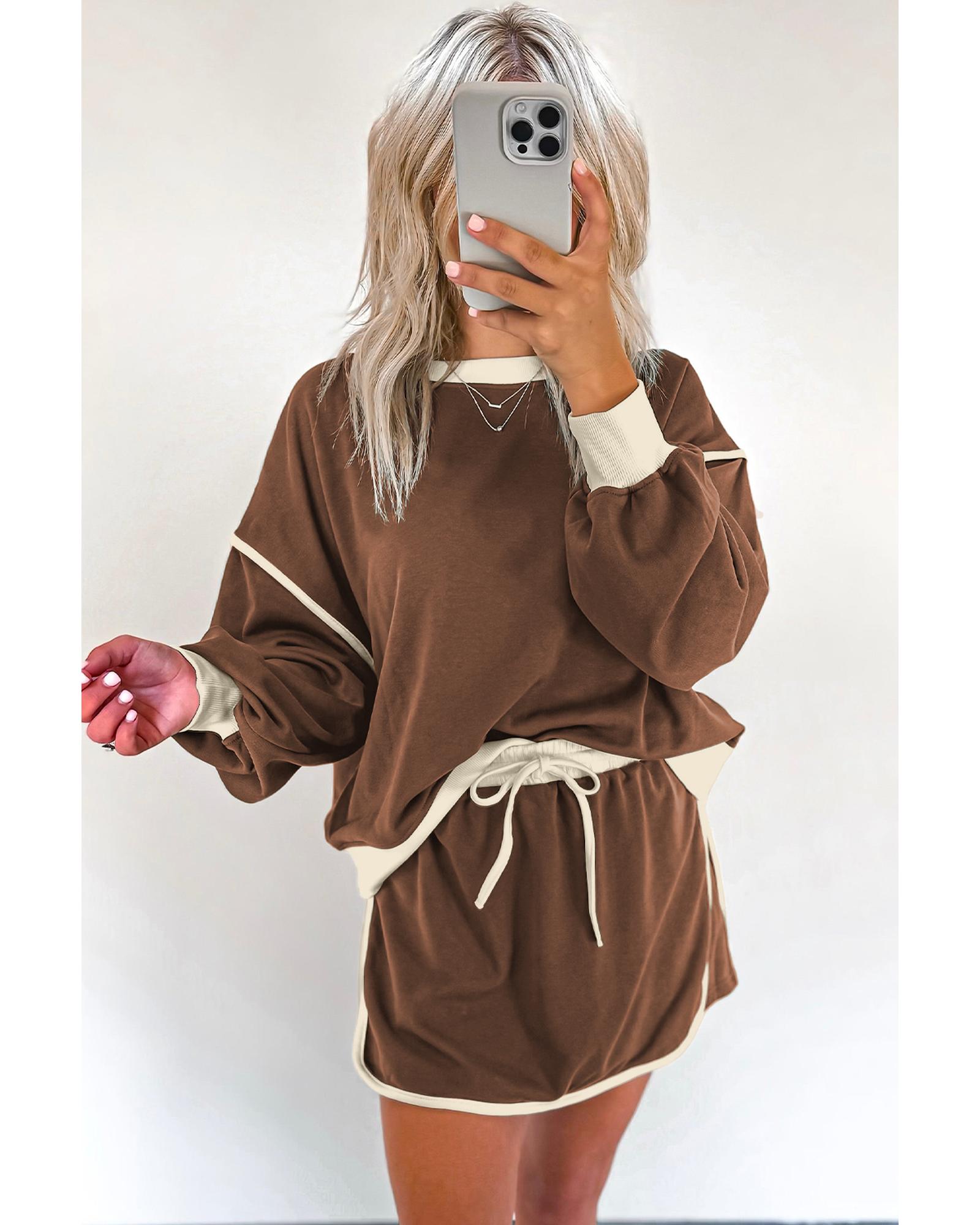 Coffee Color Contrast Loose Pullover and Lace-up Waist Skort Set – L