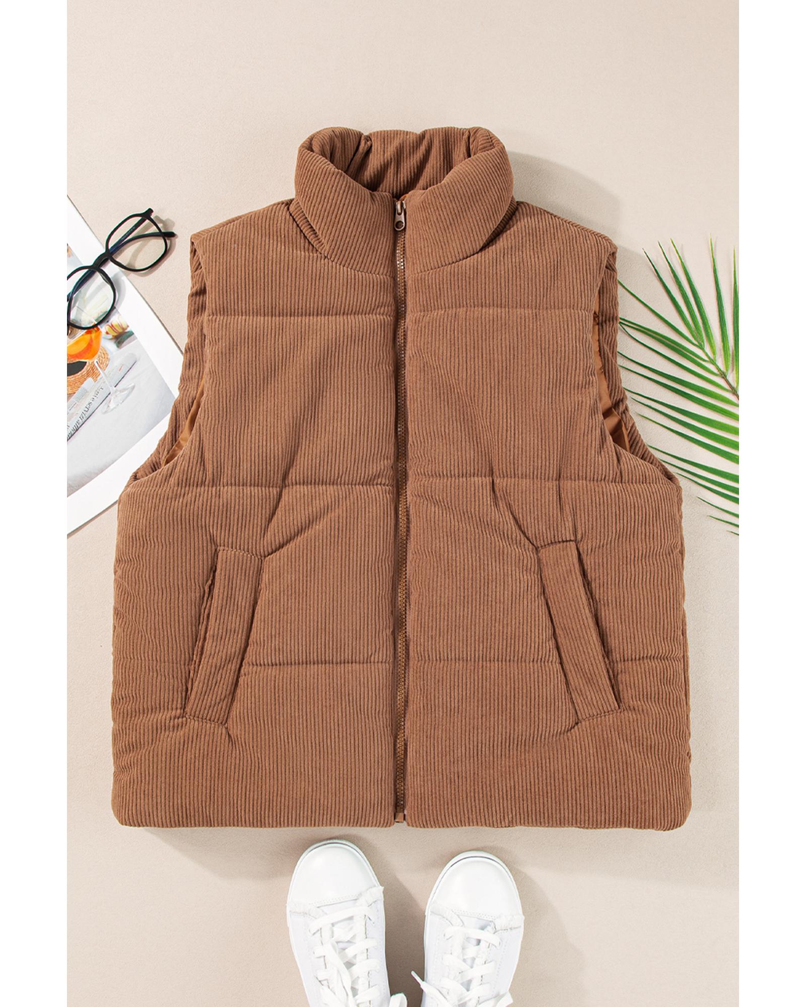 Coffee Corduroy Stand Neck Zipped Puffer Vest – S