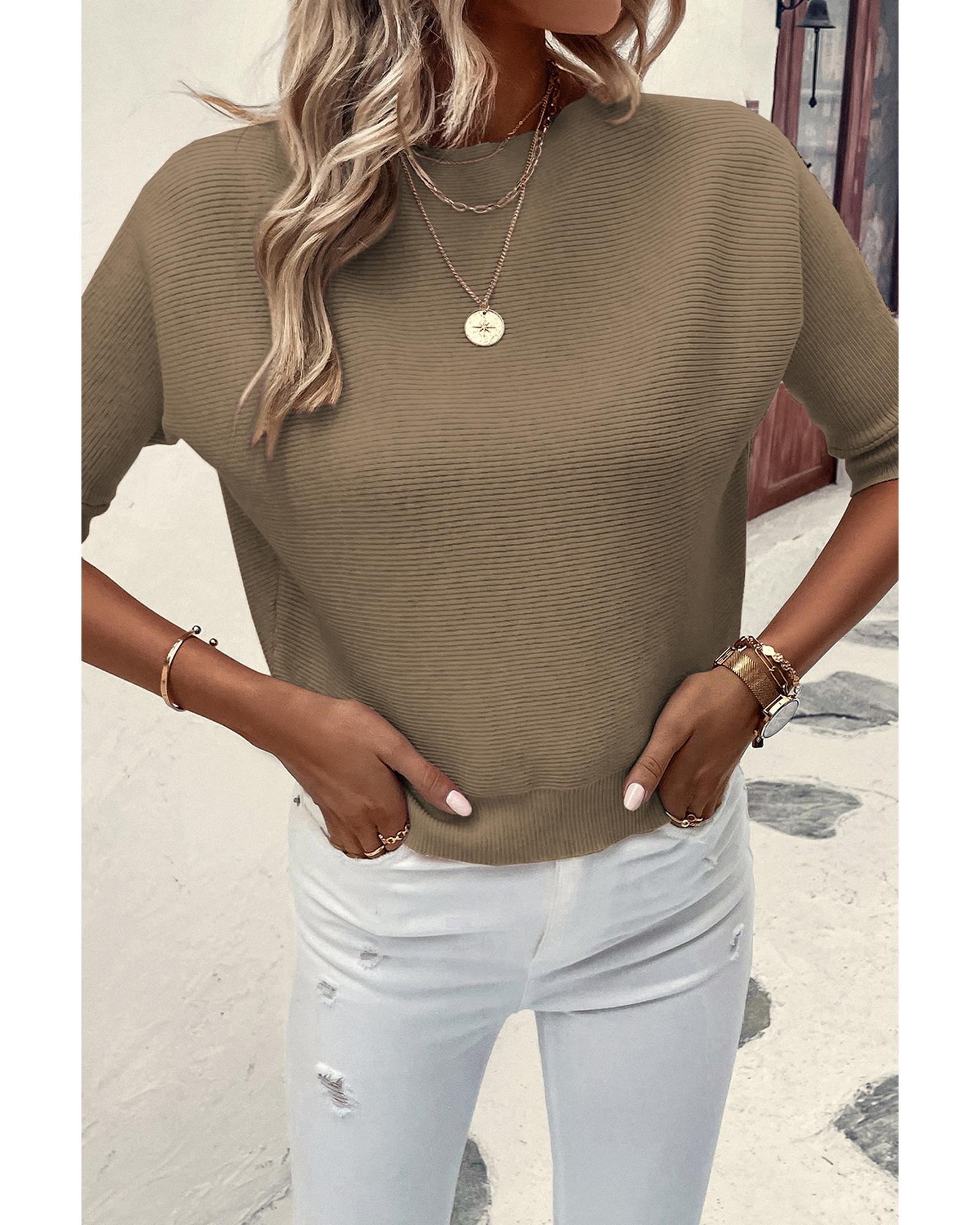 Coffee Round Neck Half Sleeve Ribbed Knit Top – XL