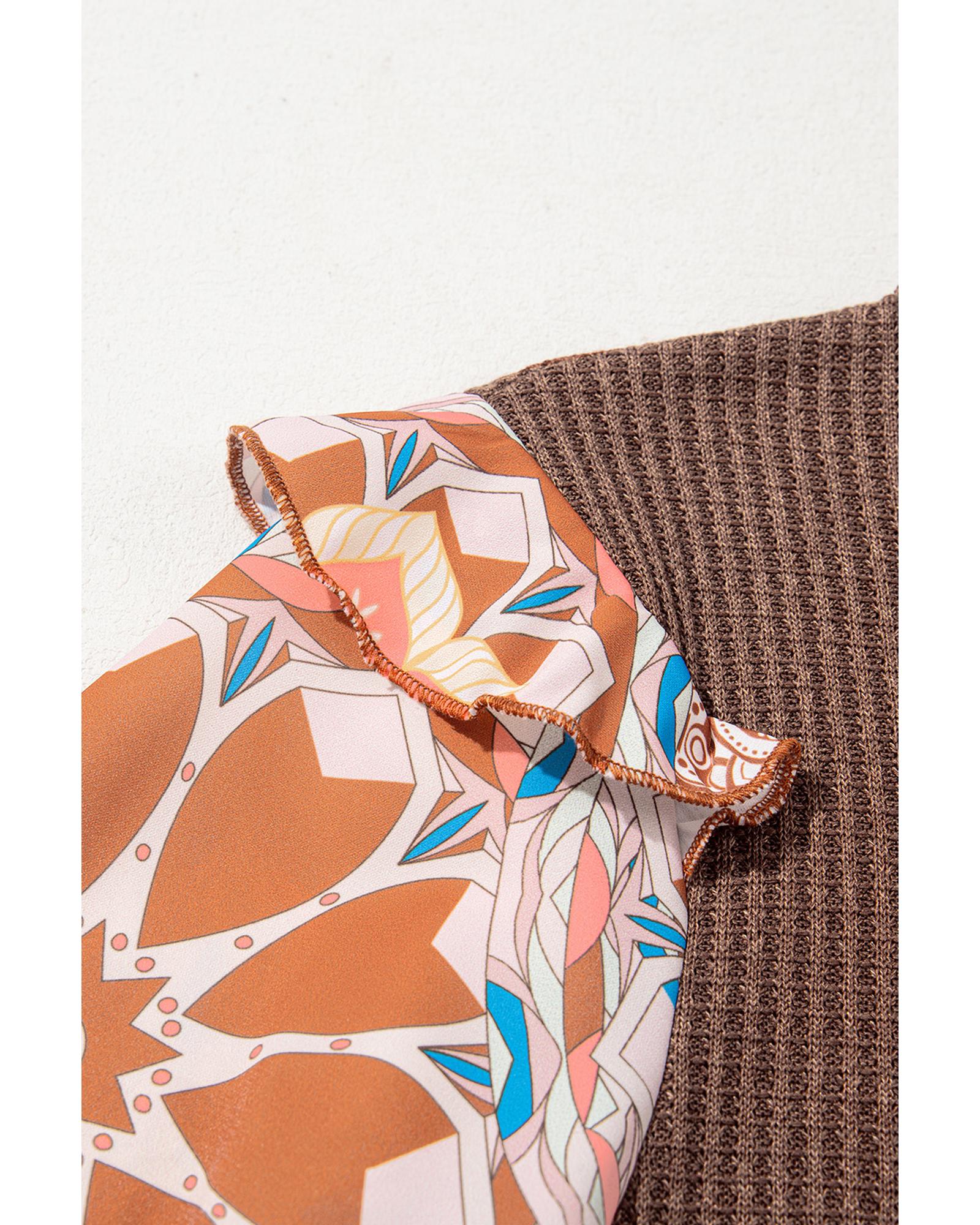 Coffee Ruffled Floral Sleeve Patchwork Waffle Knit O Neck Blouse – L