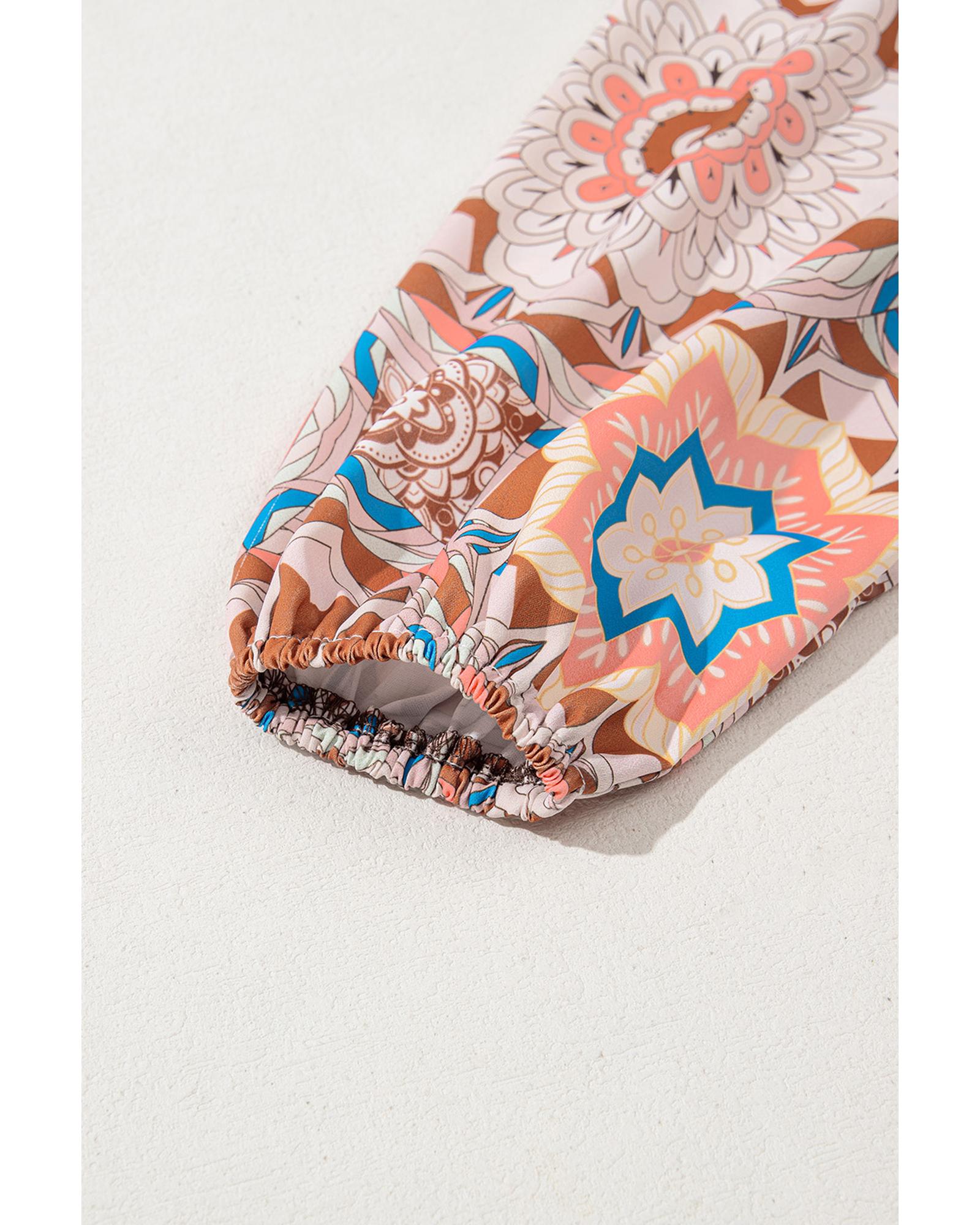 Coffee Ruffled Floral Sleeve Patchwork Waffle Knit O Neck Blouse – XL