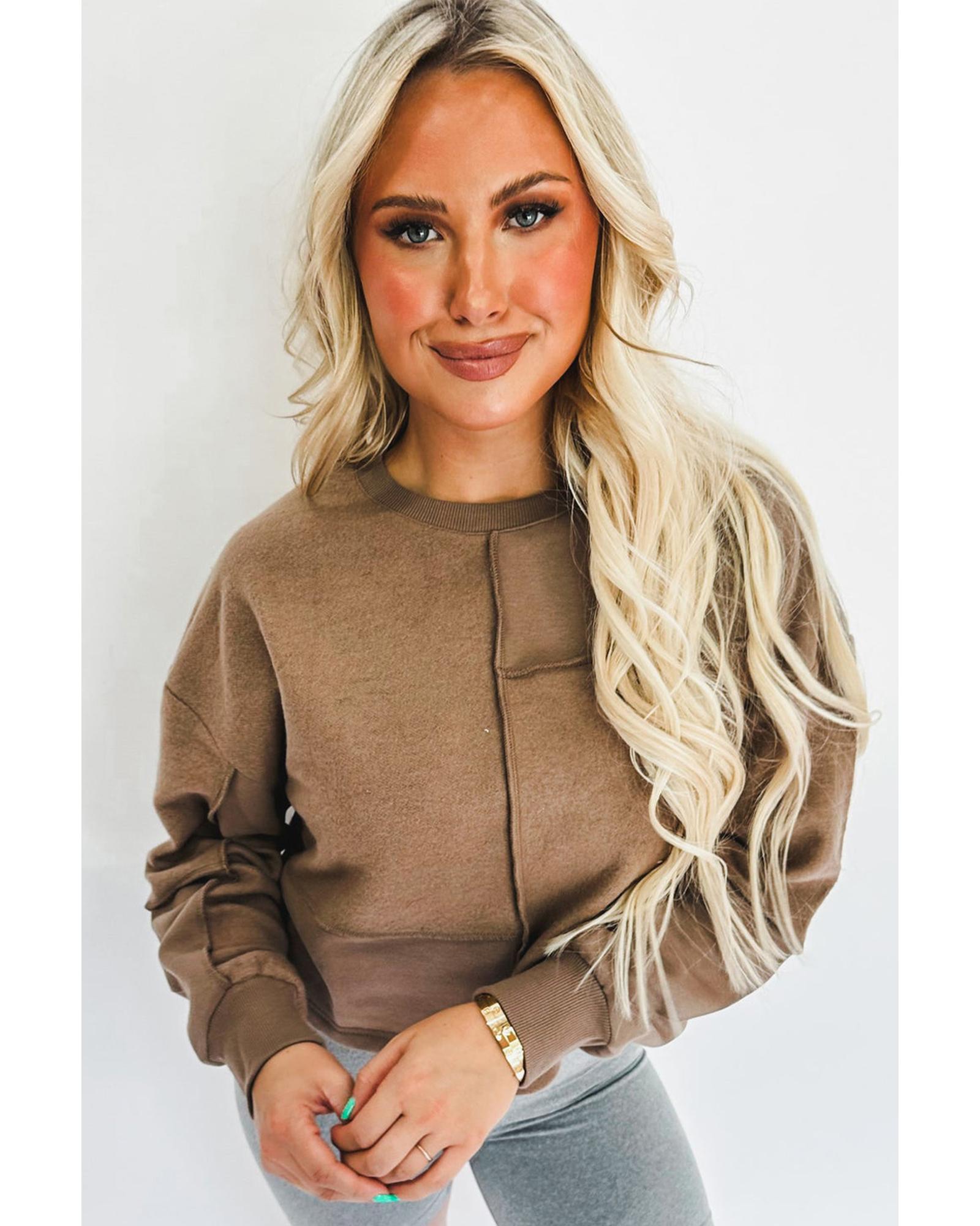 - Coffee Solid Exposed Seam Pullover Sweatshirt