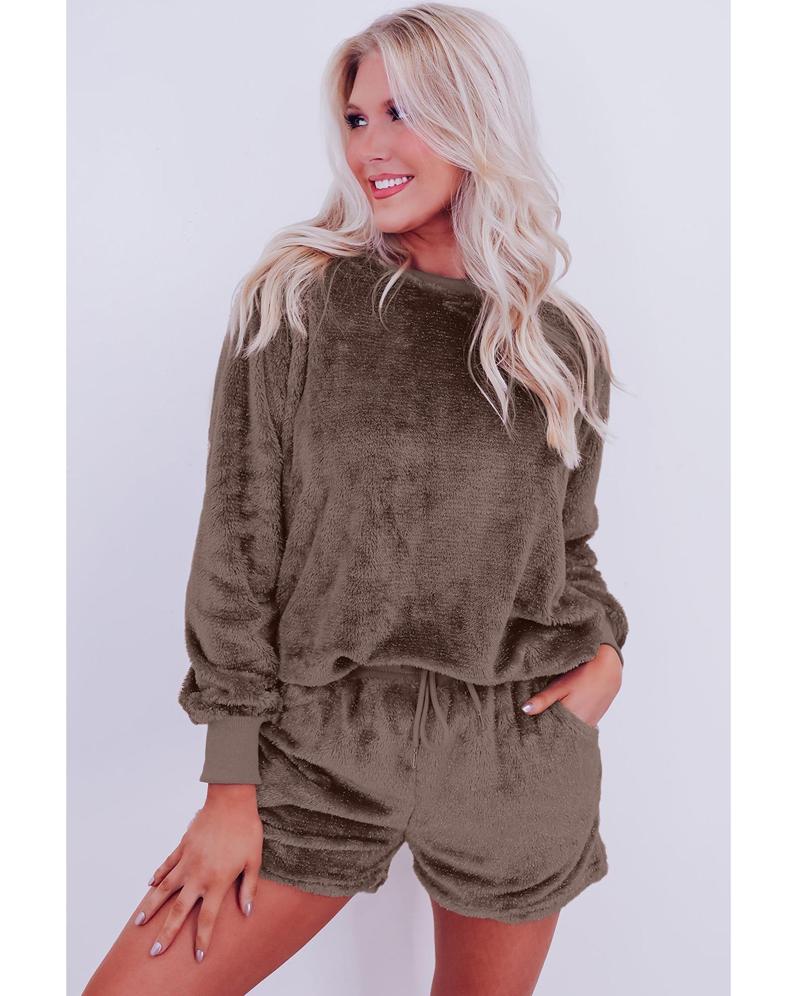 • Coffee Solid Loose Fit Two Piece Fleece Lounge Set
