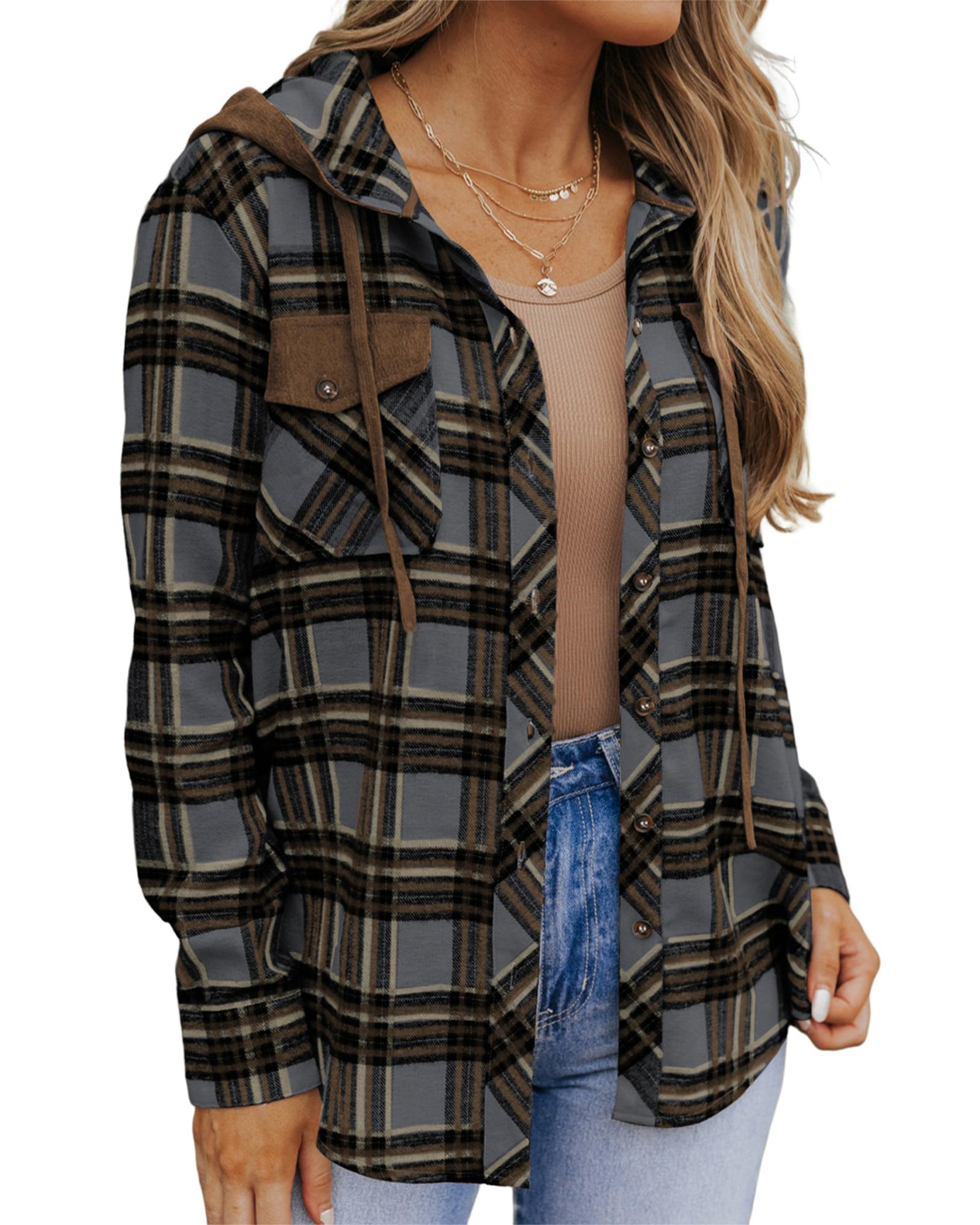 Contrast Hooded Drawstring Plaid Shacket – S