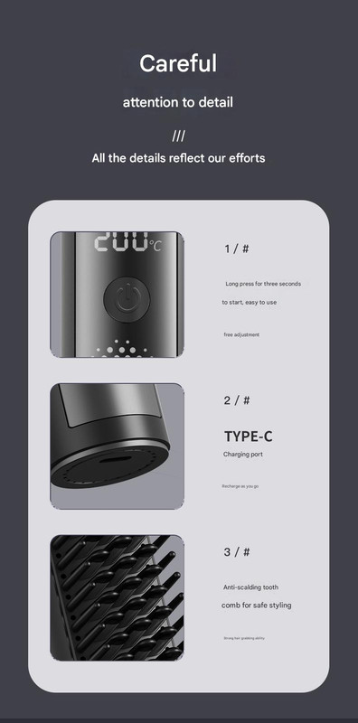 Achieve salon-quality hairstyles on the go with our Cordless Hair Straightener Comb. This innovative styling tool features a 3D staggered comb tooth design that provides strong hair gripping and an anti-scald feature, ensuring smooth styling while protecting your scalp and preventing burns. With rapid 30-second PTC constant temperature heating and NTC intelligent temperature control, it delivers even heat distribution, helps maintain hair moisture balance, and prevents heat damage. Choose from 4 intelligent constant temperature settings (140C, 160C, 180C, 200C) to suit various hair types, from damaged to coarse hair. Its wireless, portable design with convenient Type-C charging makes it perfect for straightening, creating inward curls, styling bangs, or achieving voluminous looks anytime, anywhere. Easy to use with a long-press 3-second start function and clear temperature display.