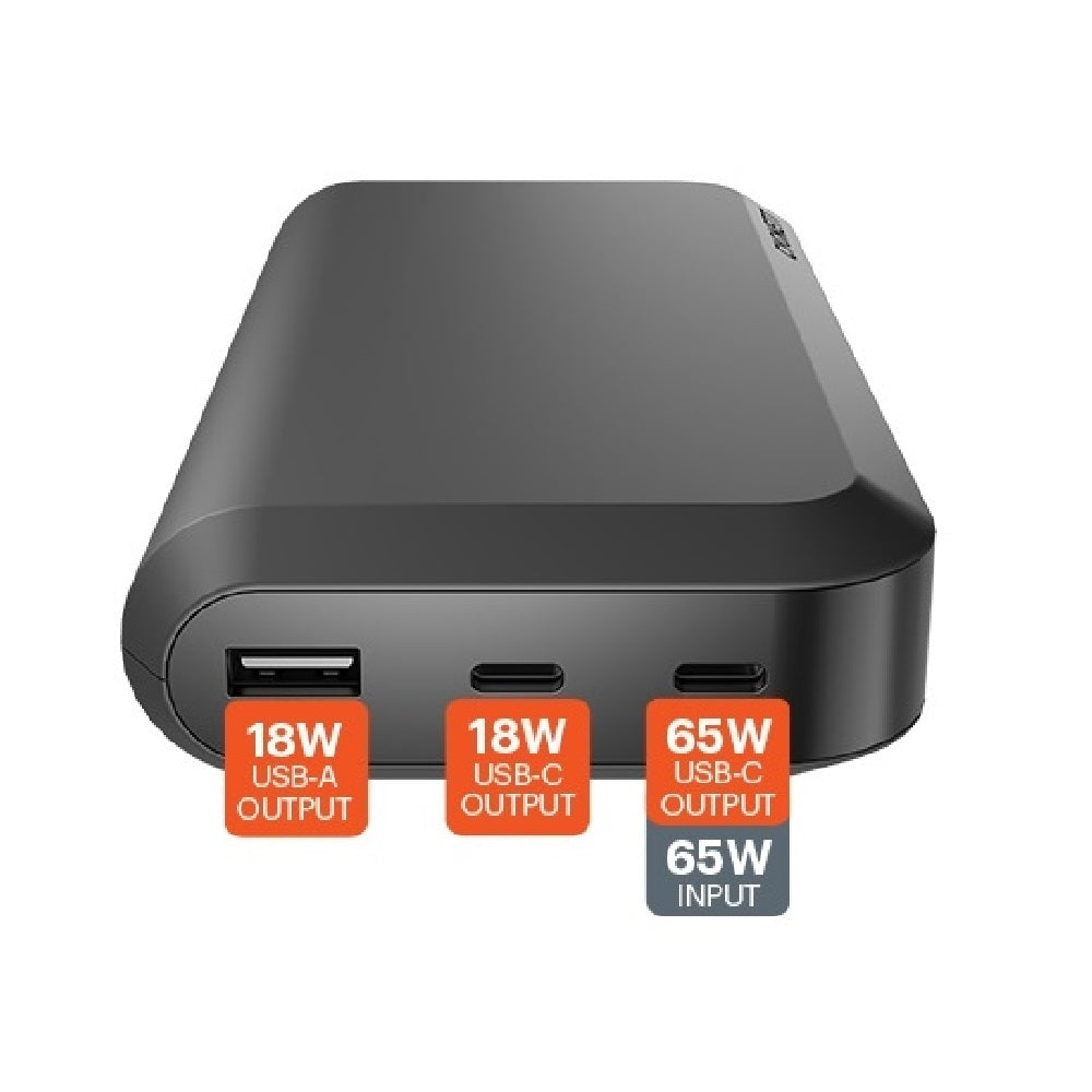 This pro-grade power bank a¬ffords you the luxury to work, live and play from anywhere. The max charging output of 65W can be delivered from a single USB C port, which combined with a large battery capacity (20,000 mAh), is more than enough to charge powerful USB-C laptops.