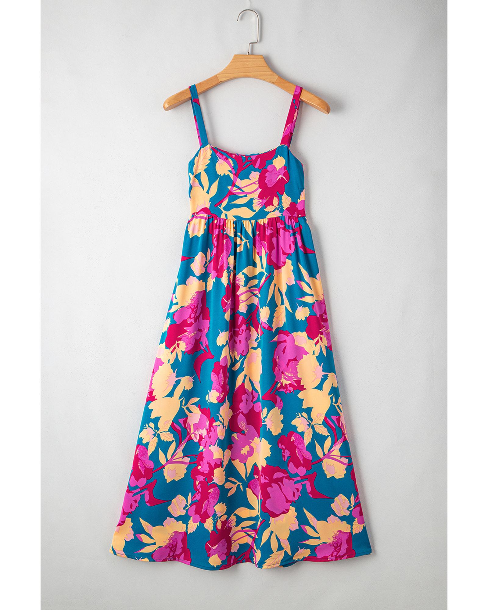 Dark Blue Floral High Waist Sleeveless Flared Long Dress – S