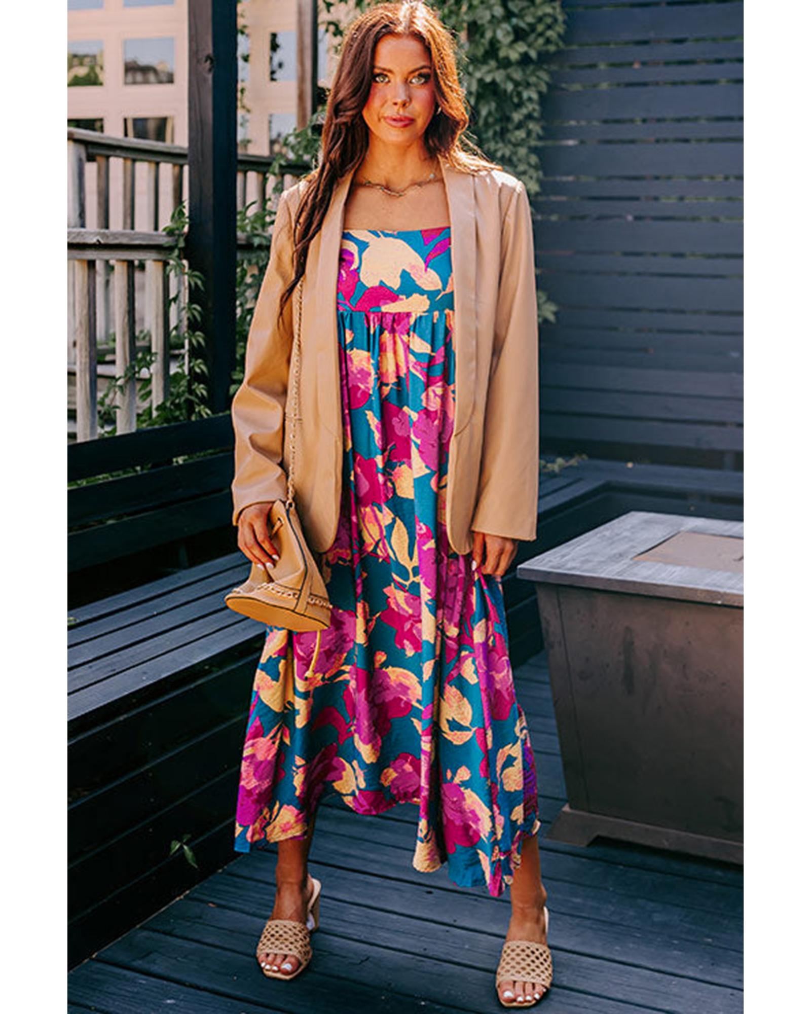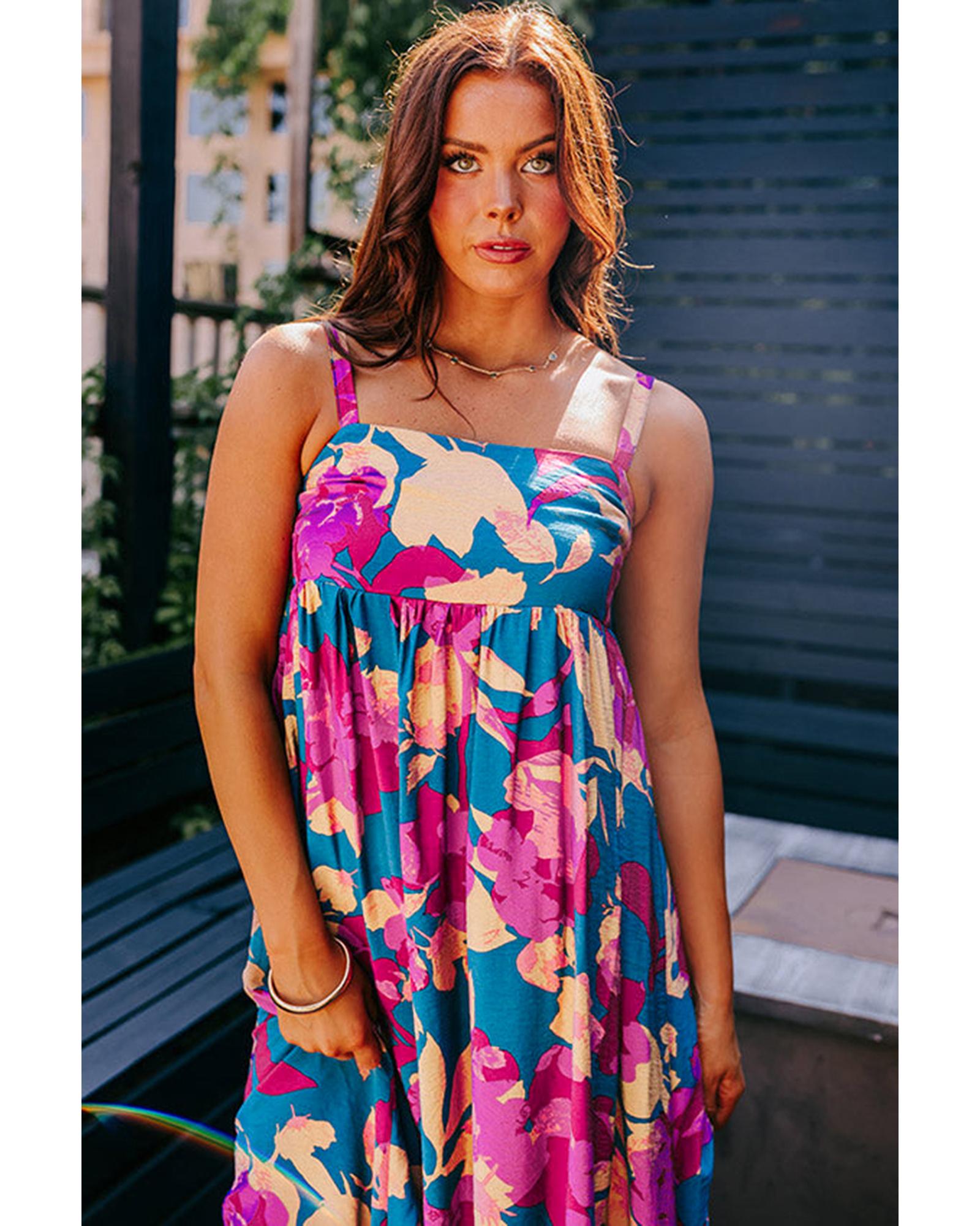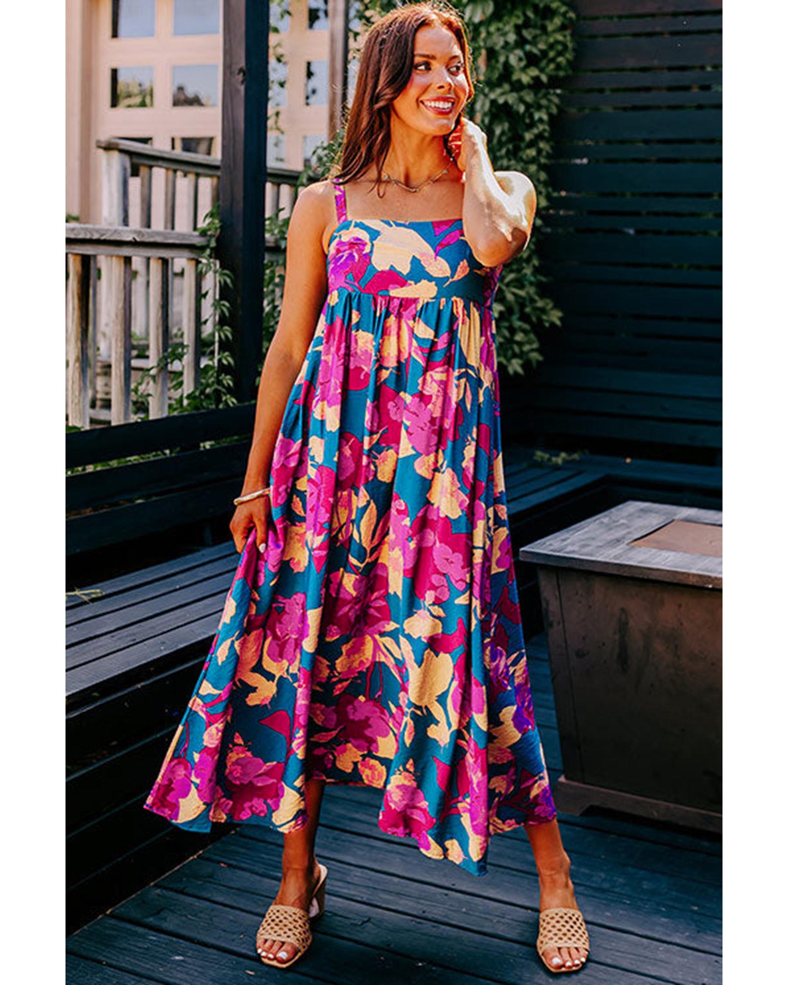 Dark Blue Floral High Waist Sleeveless Flared Long Dress – XL