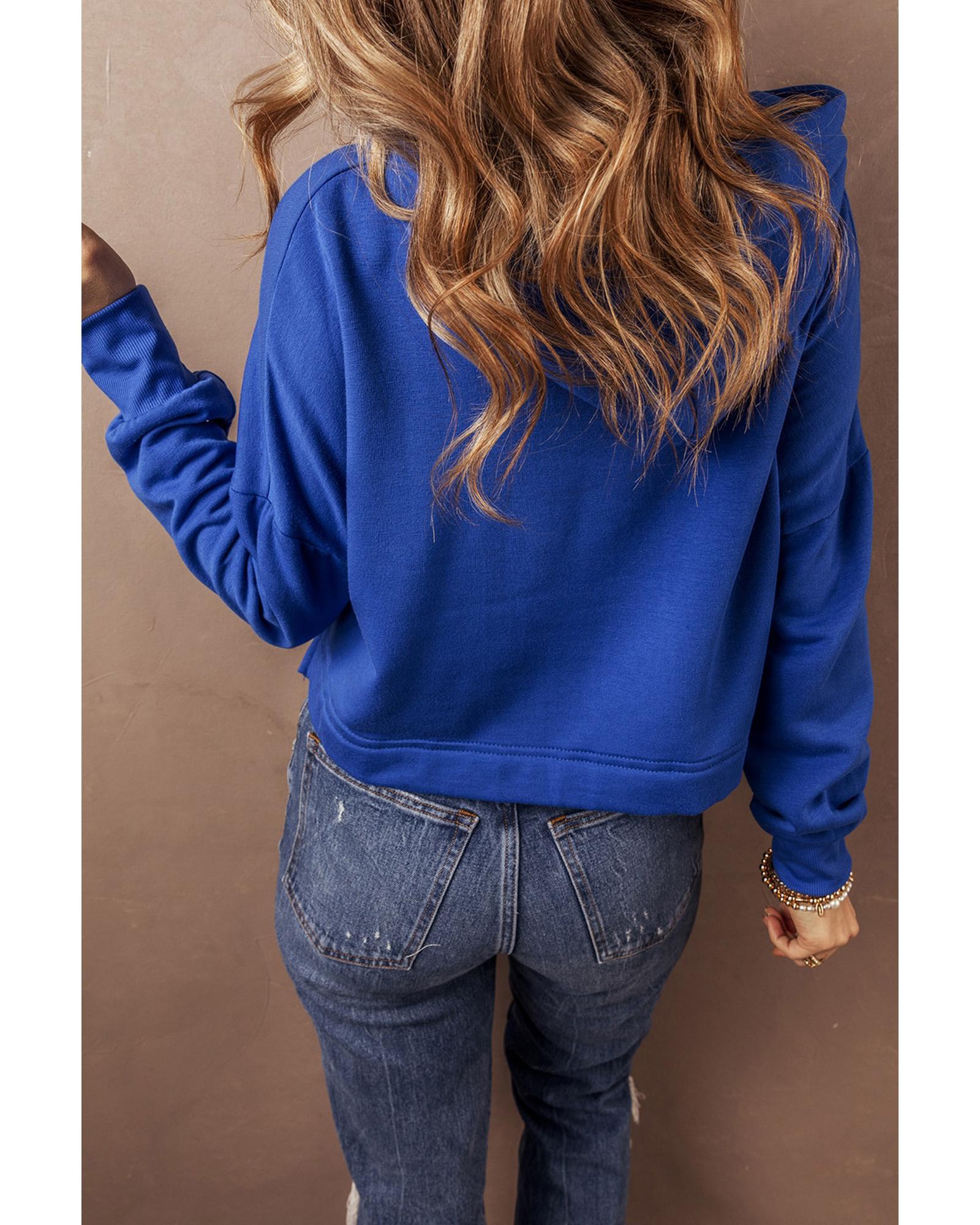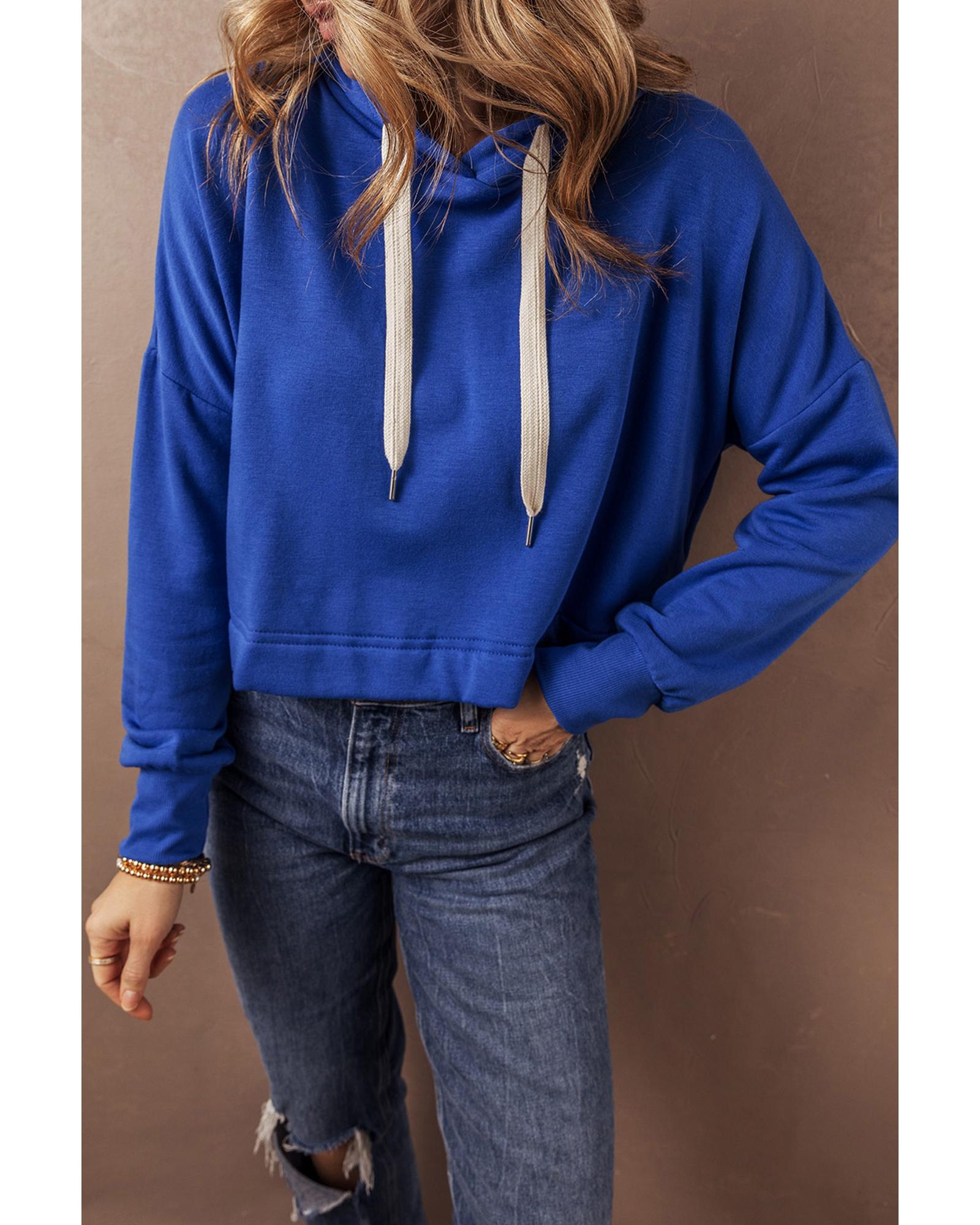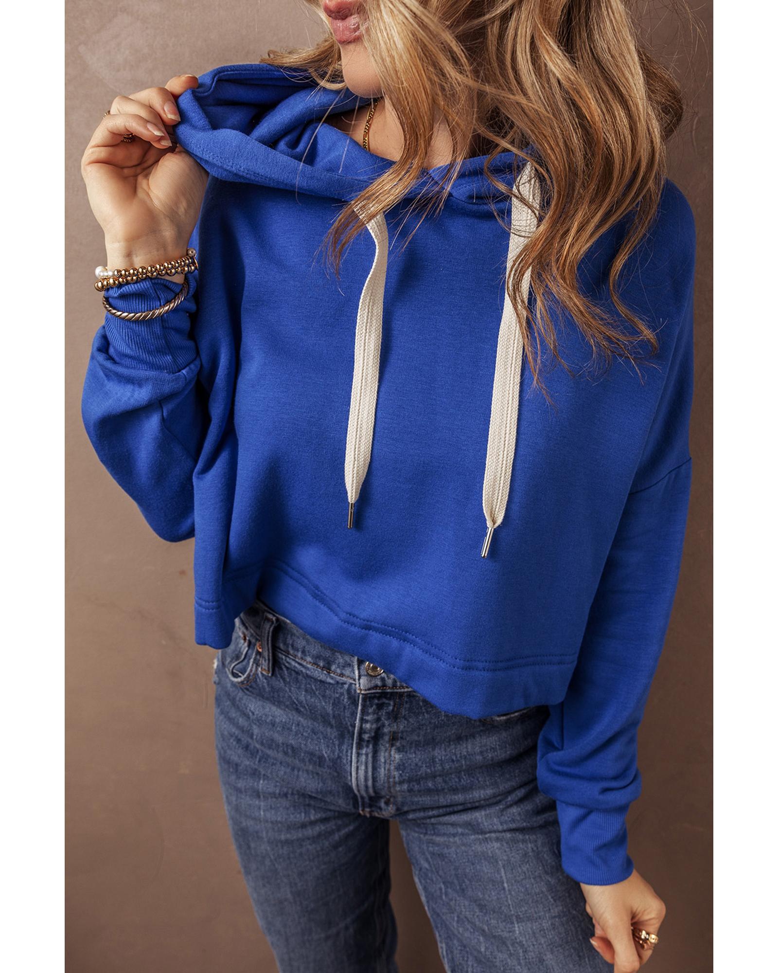 Dark Blue Solid Drop Shoulder Drawstring Cropped Hoodie – L