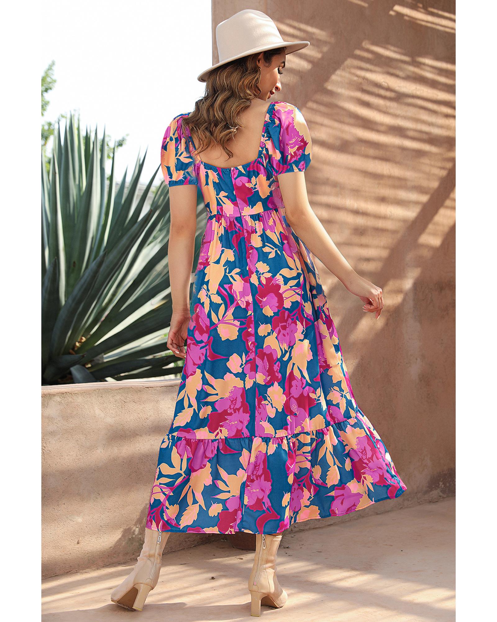 Dark Blue Square Neck Bubble Sleeve Ruffled Floral Dress – L
