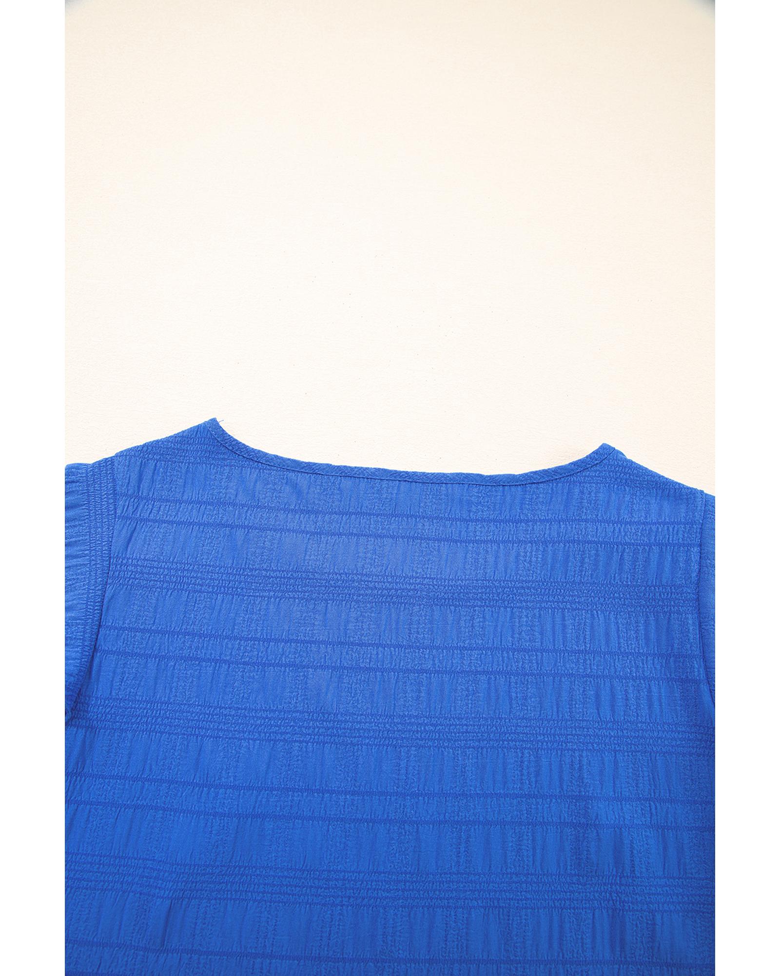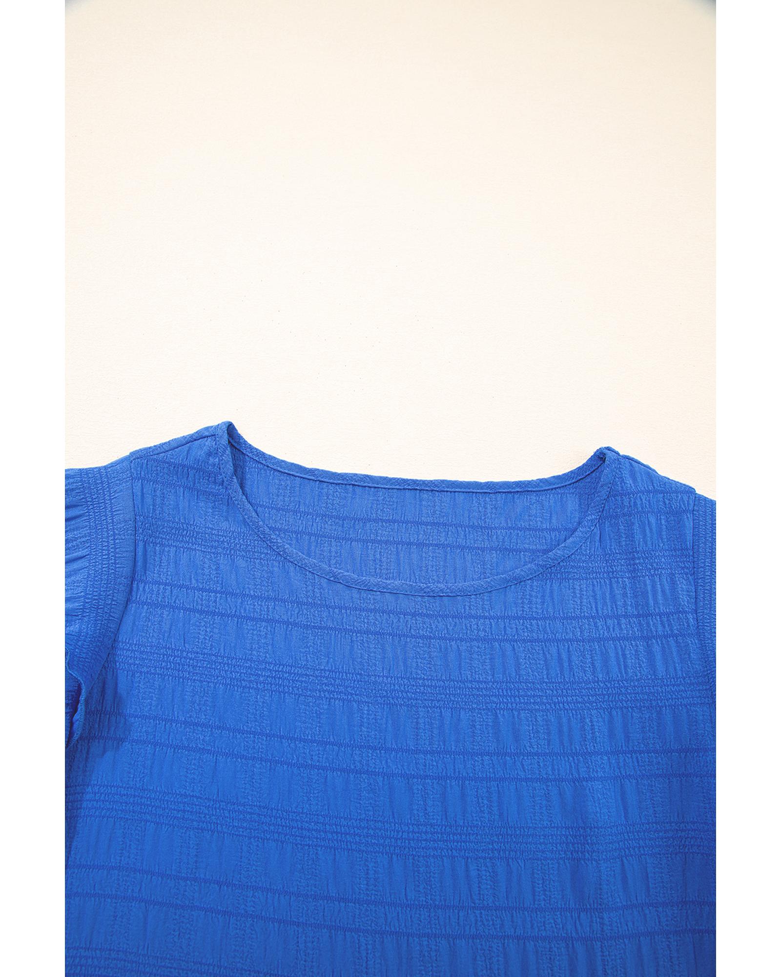 Dark Blue Textured Ruffled Sleeve Round Neck Top – M