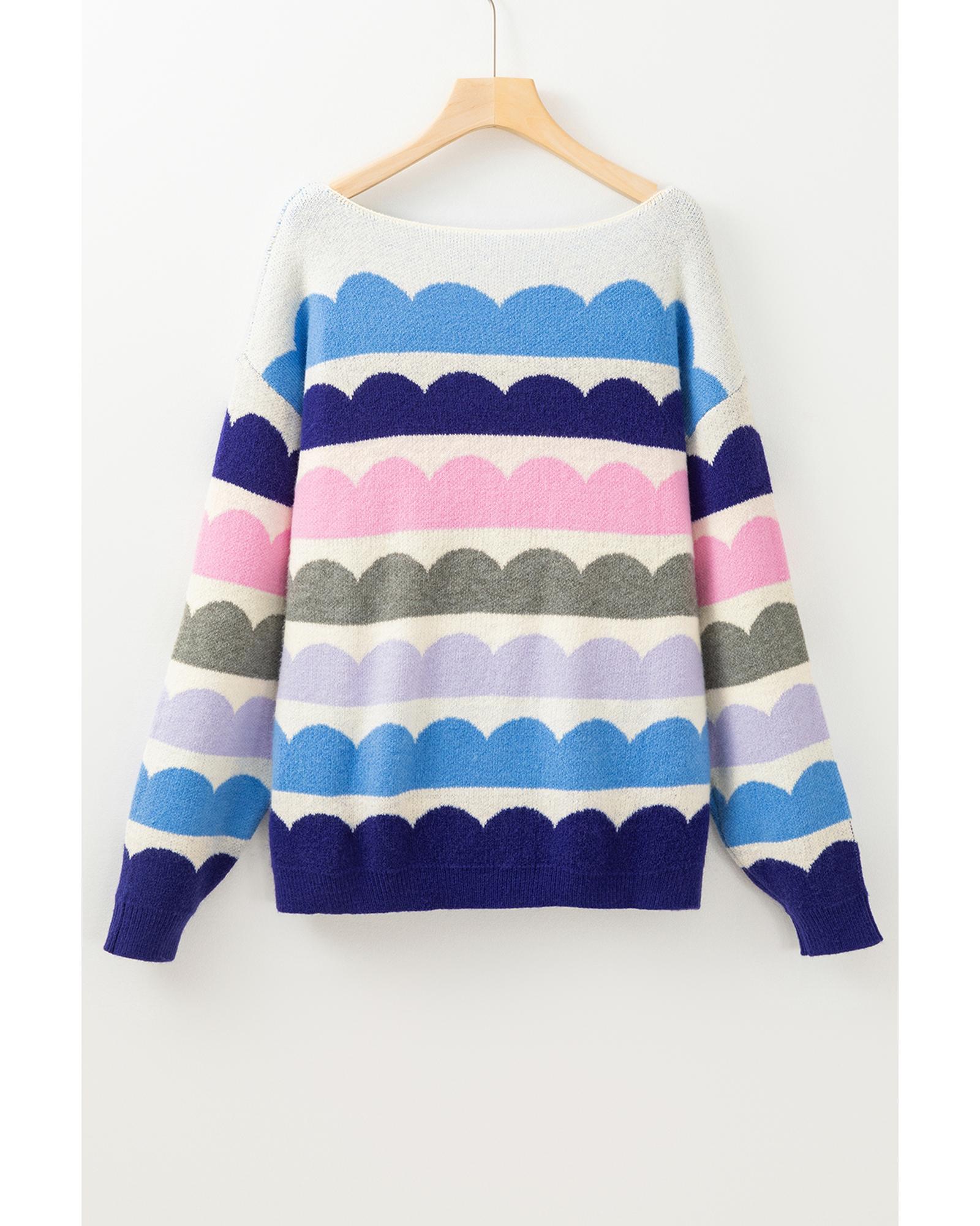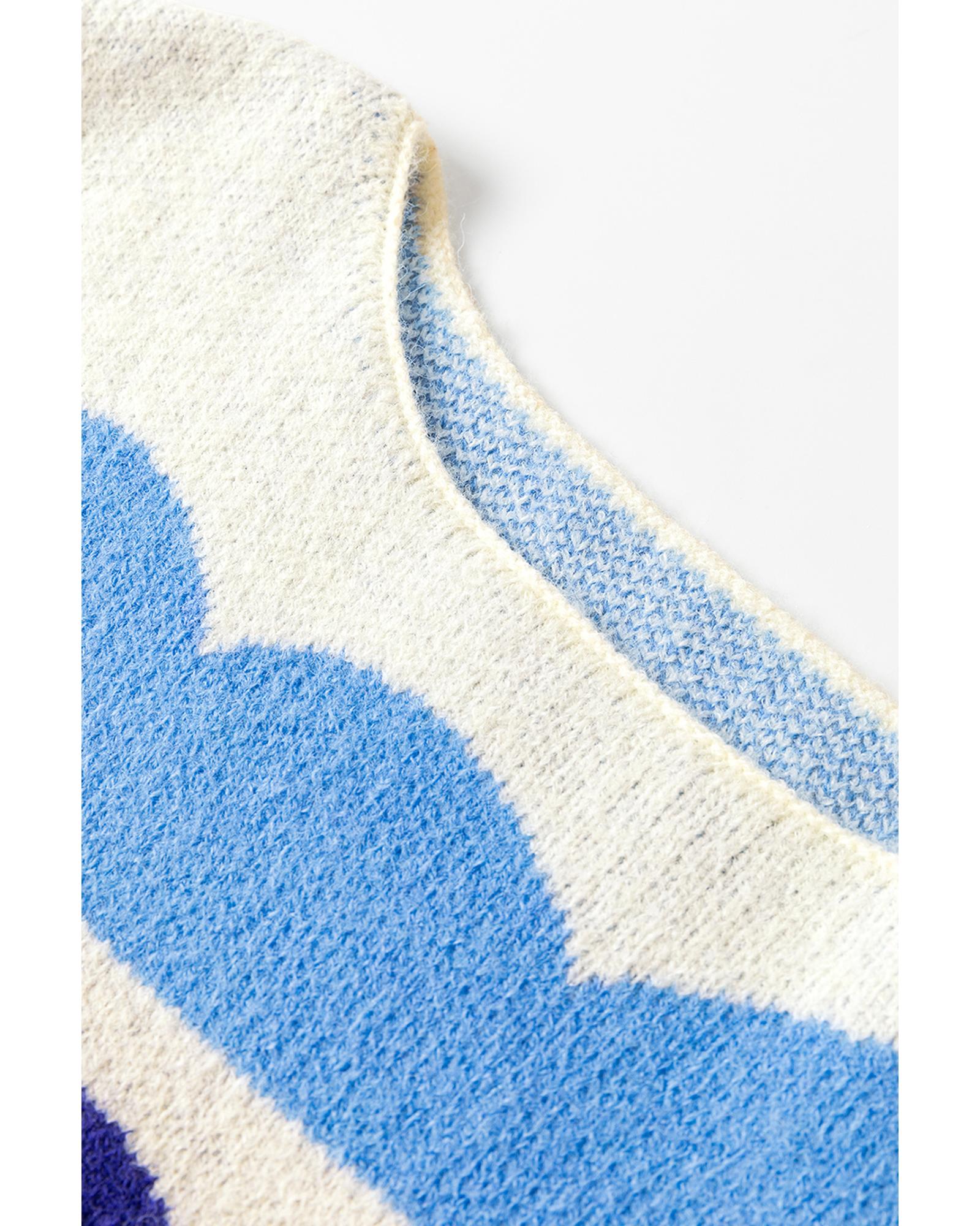 Dark Blue Wave Striped Balloon Sleeve Drop Shoulder Sweater – L