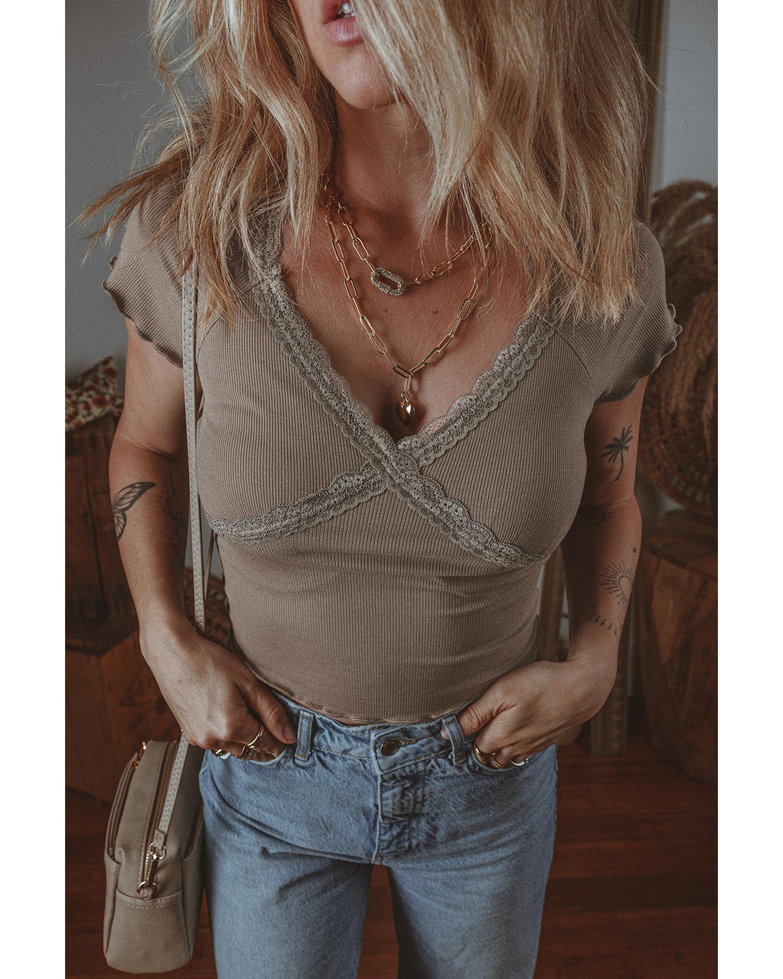 Dark Brown Lace Splicing Criss Cross Slim Fit V Neck T Shirt – S