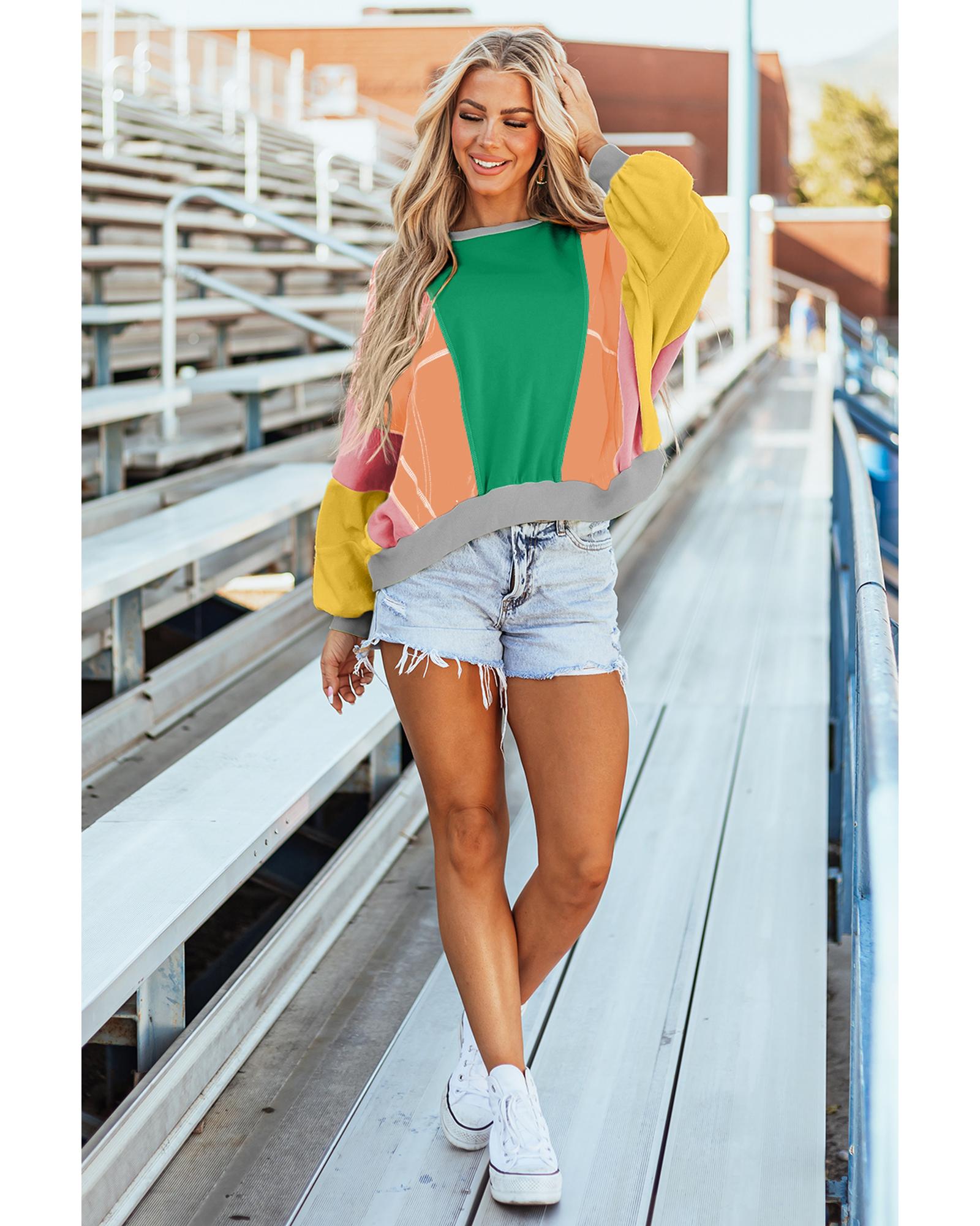 Dark Green Colorblock Patchwork Exposed Stitching Oversize Top – S
