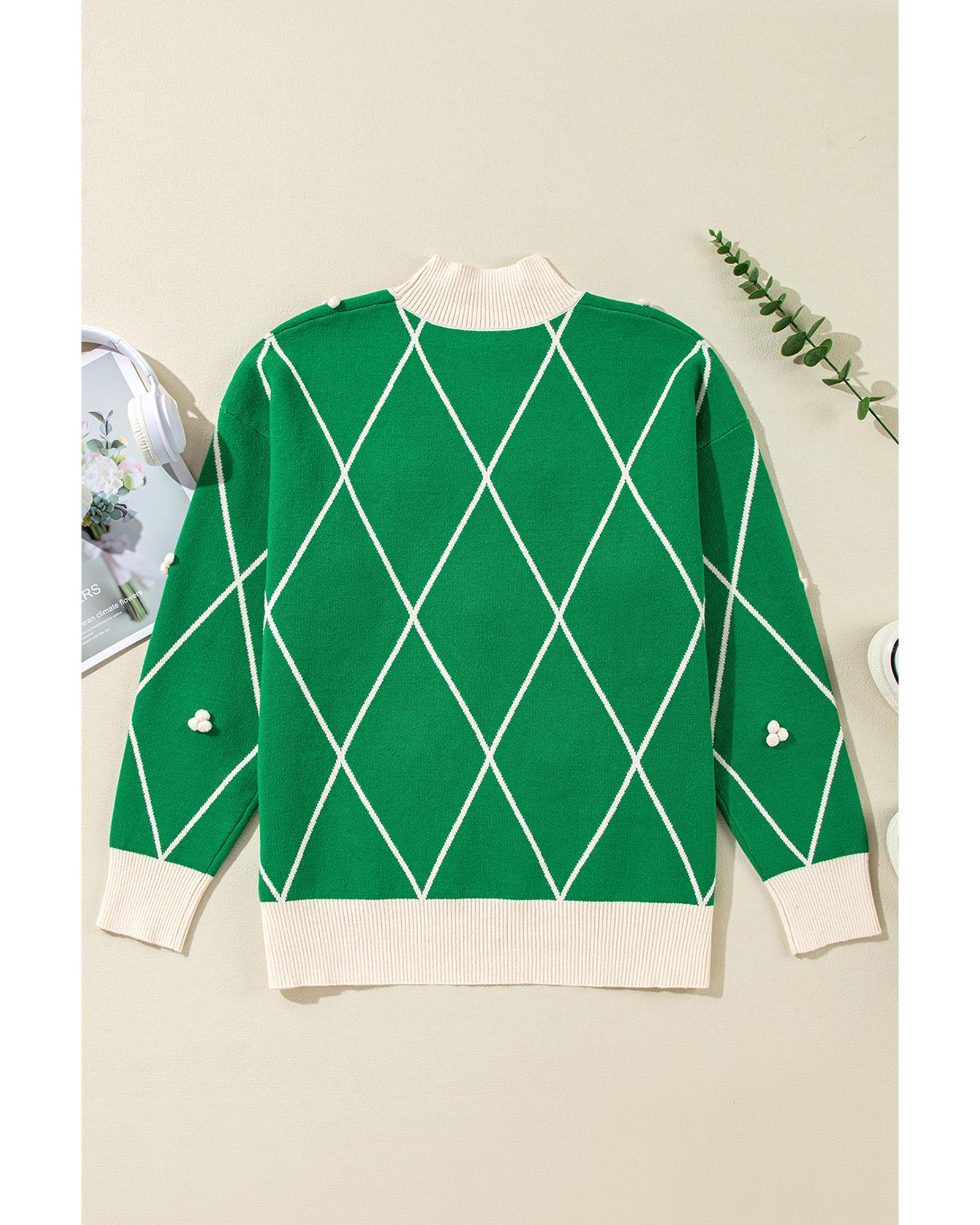 Dark Green Diamond Pattern Pom Accents Contrast Trim High Neck Sweater – M
