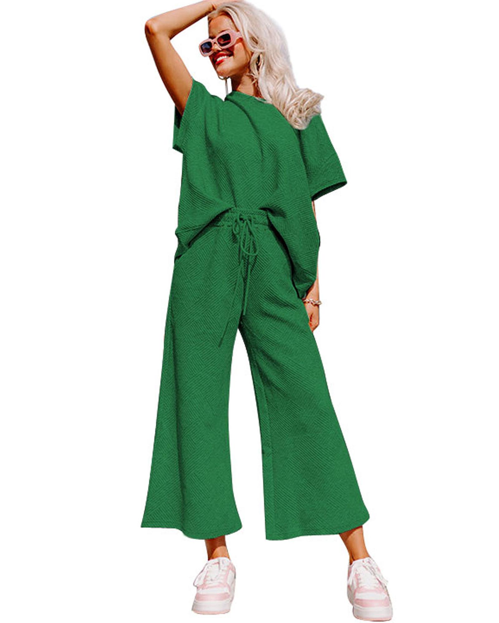 Dark Green Textured Loose Fit T Shirt and Drawstring Pants Set – M