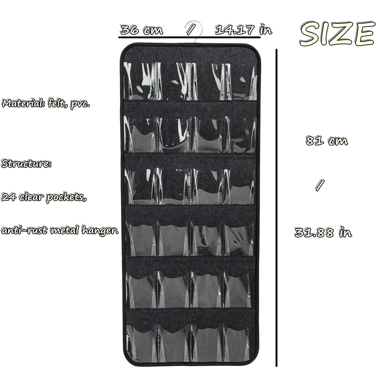• 24 Clear Pockets: Designed to hold up to 12 pairs of shoes or various items such as toys, accessories, and more.