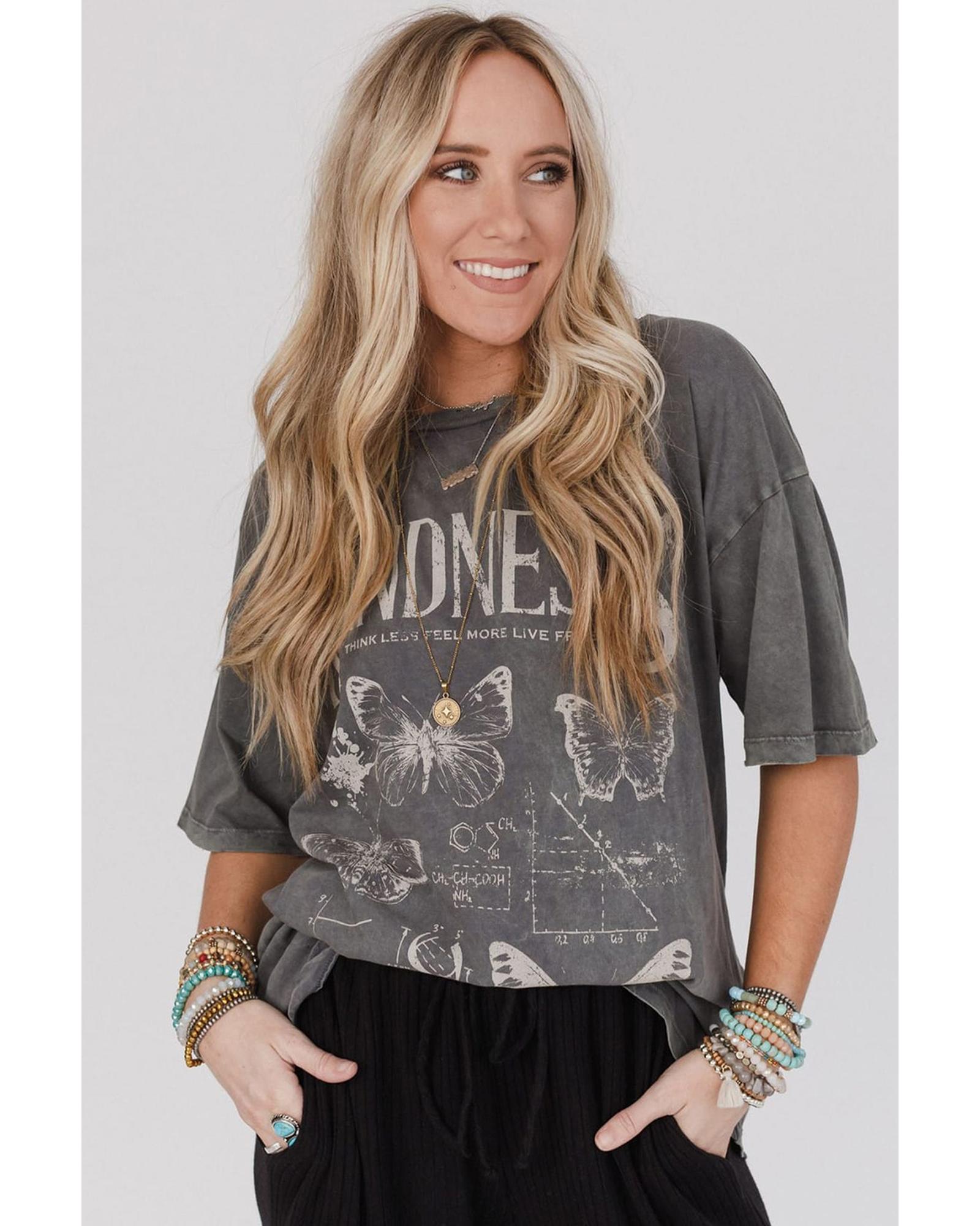 Dark Grey Kindness Butterflies Graphic Mineral Wash Loose Tee – S